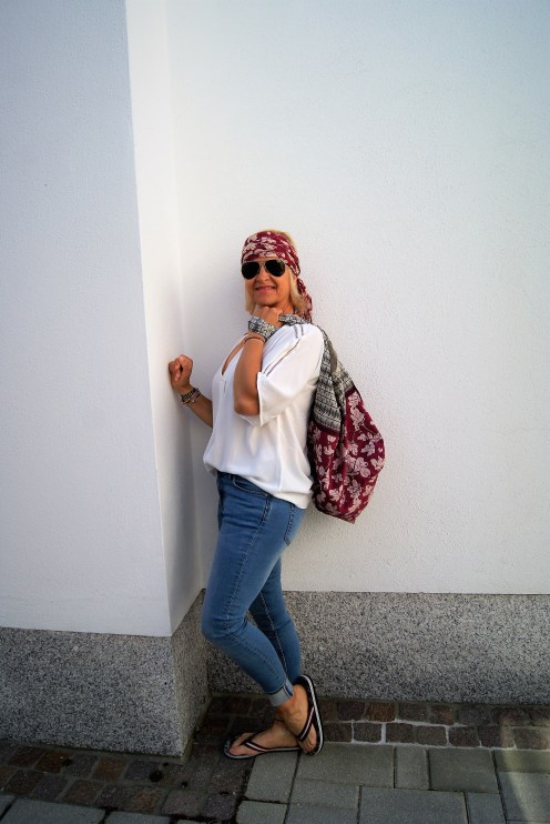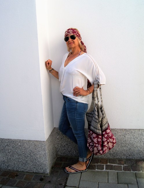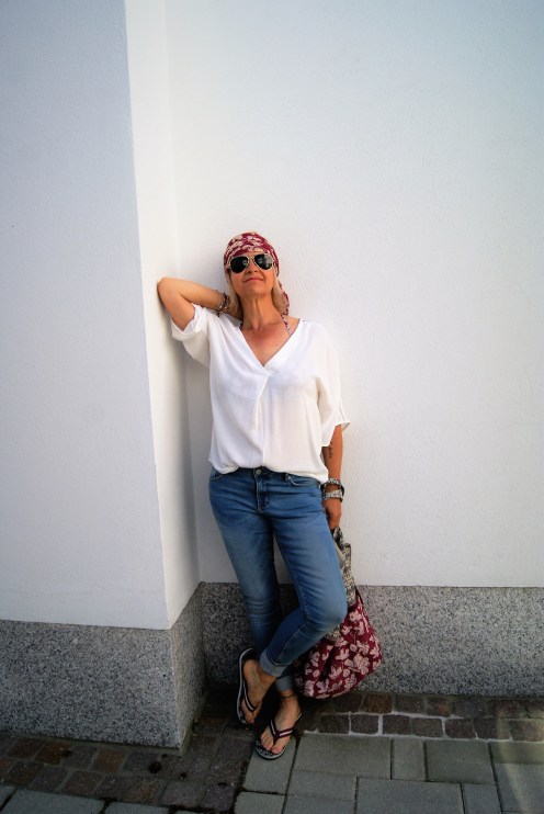 Mein Outfit ist eigentlich ganz einfach und nur die Accessoires machen es aus, denn eine Jeans hat doch jeder, kombiniert mit einer Oversizebluse – meine in diesem Fall jetzt –  mit Lochstickerei am Arm und du hast es schon fast geschafft. Damit auch alles mit kann was mit muss ist der Oversizeshopper in Baumwolle ideal ( den kannst du auch in der Waschmaschine waschen). Im selben Print ein Tuch und die Flip-Flops dazu und der Look ist fertig.
