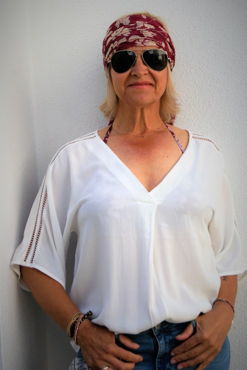 Was man nur erahnen, bzw. an den Trägern sehen kann,  ist, dass ich auch den Bikini im Print der Tasche und des Tuches dazu an habe, aber soviel Freizügigkeit kann ich mir nicht mehr erlauben, das überlasse ich den knackigen Jungen.