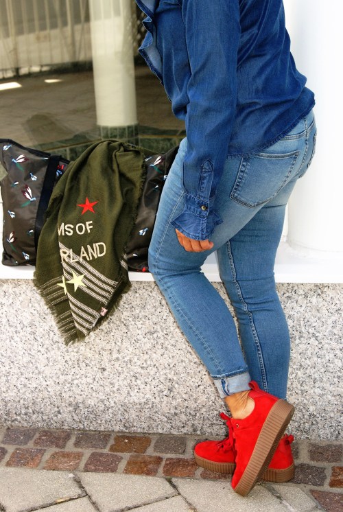 Zu meinem Outfit ist eigentlich gar nicht viel zu sagen, außer, dass ich schon wieder Jeans mit Jeans kombiniert habe, ich mag das. Außerdem gibt´s neue Sneakers in ROT und ebenfalls NEW IN – ein Shopper, den noch ein kleines Schminktäschchen und ein Kosmetiktasche ergänzen. Und wie es der Zufall will, wiederholt sich das Rot in der Tasche und auch das Tuch hat die selben Farben wie die Tasche.