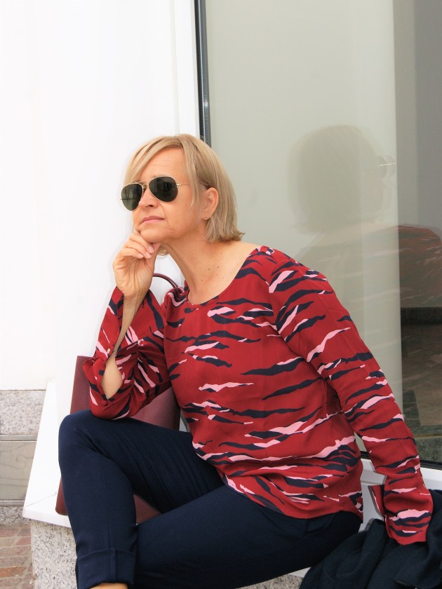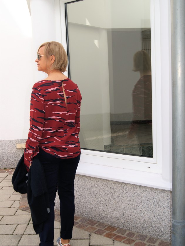 … ich und Muster. Na ja, sag niemals nie. Schaut doch ganz ordentlich aus oder!? und ich fühl mich auch sehr wohl darin. Nur so ganz tierisch ist es nicht oder habt ihr schon mal so ein rostbraun/blau/rosa farbiges Irgendwas herumlaufen sehen? Wenn ja, bitte bei mir melden. Das Outfit schaut ja – trotz tierischem Touch -richtig nach Business aus, was meint ihr? Die dunkelblaue Hose und der lange Cardigan sind ja eigentlich Allrounder, die kann man echt vielseitig kombinieren. Außerdem ist der Longcardigan doppelgestrickt, dass heißt ideal für die Überganszeit, da er als Mantel getragen werden kann und er ist innen grau, das schaut echt nett aus wenn die Ärmel etwas umgeschlagen werden, der ist auch ideal zur Jeans, aber genauso über ein Kleid oder zum Rock. Die stretchige Hose ist so schmal geschnitten, dass ich auch super lange Oberteile darüber tragen kann und …… sie hat einen Gummizug.