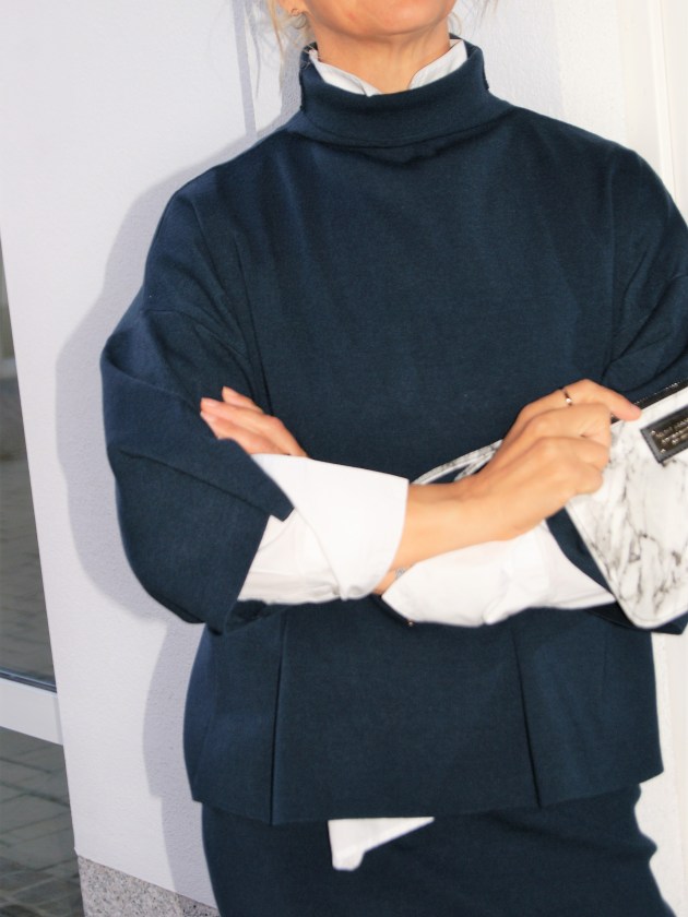 Aber jetzt zu meiner Kombi, der feine Strick ist total angenehm zu tragen und da der Rock sehr schmal ist, schreit er förmlich nach einem kürzeren weiten Oberteil. Der dazu passende Pullover ist kastig geschnitten und hat verkürzte weite Ärmel, ideal um darunter eine Bluse oder ein Shirt im Winter zu tragen, aber auch für noch wärmere Tage mal nur den Pulli zu tragen. Ich glaub, das wird meine Lieblingskombi, die schaut nicht nur schick aus, sondern ist so richtig bequem. Ein toller cleaner Style mit dem gewissen „Etwas“, in diesem Fall beim Rock der Schlitz hinten und beim Pullover der Kragen und die weiten Ärmel. Aber genug gequatscht, hier die Fotos.