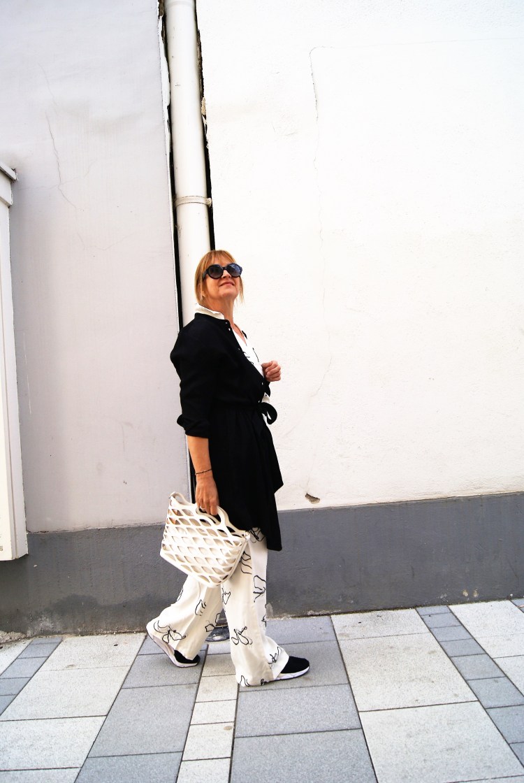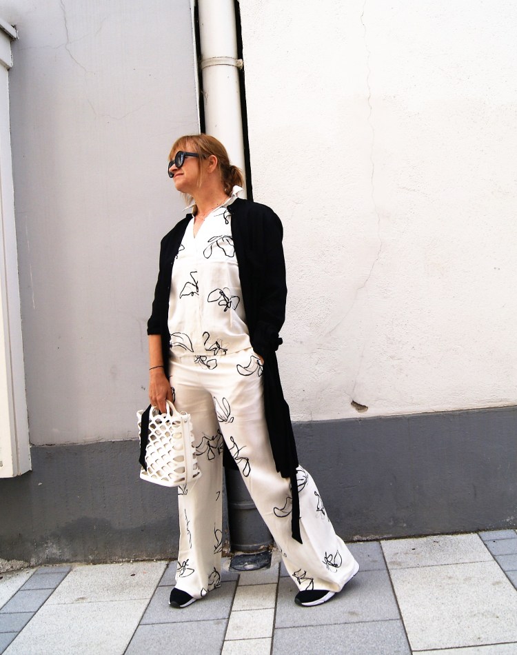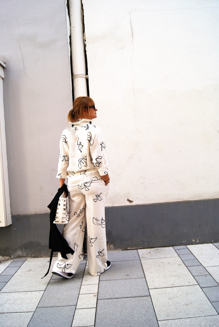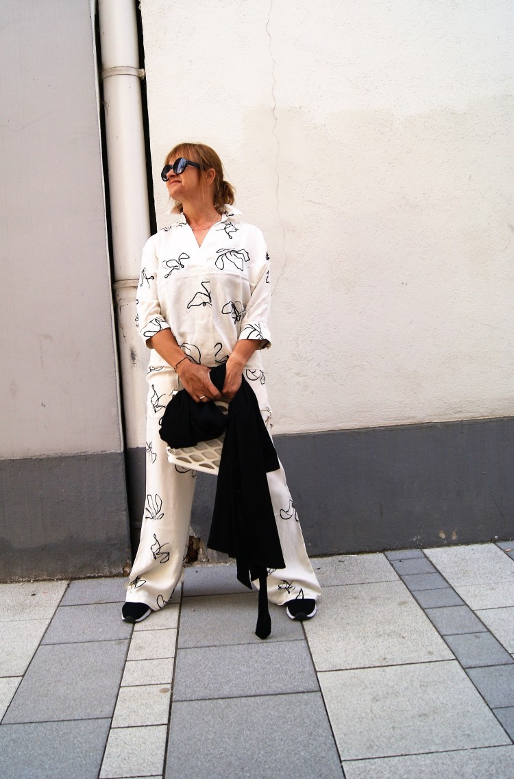 Die Teile müssen jedoch nicht gemeinsam kombiniert werden, es geht auch einzeln und durch die Farbgebung eigentlich ganz einfach mit einfarbigen schwarzen Teilen dazu. Wobei zur Hose hab ich heute einen tollen kürzeren, grobgestrickten Baumwollpulli herein bekommen, der ist für die Übergangszeit genial dazu.