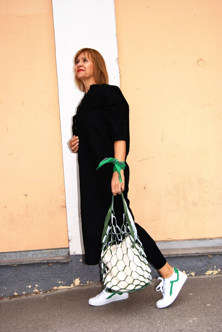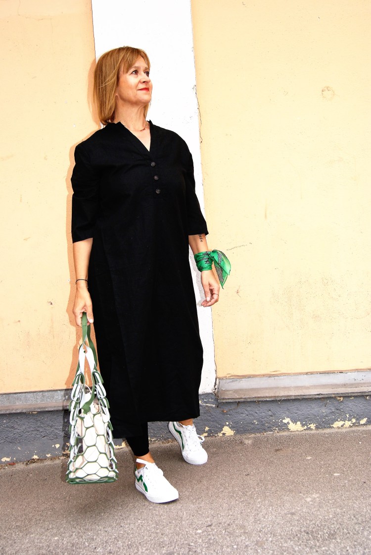 Ich hab es mit einer Leggins kombiniert und dem Outfit – mit den weiß/grünen Sneakers, dem Tuch und der Netztasche – noch einen kleinen Farbklecks beigefügt. Und so wie sich dieses Grün wiederholt kannst du jede beliebige Farbe damit kombinieren, d.h. das ideale Basic-Kleid.
