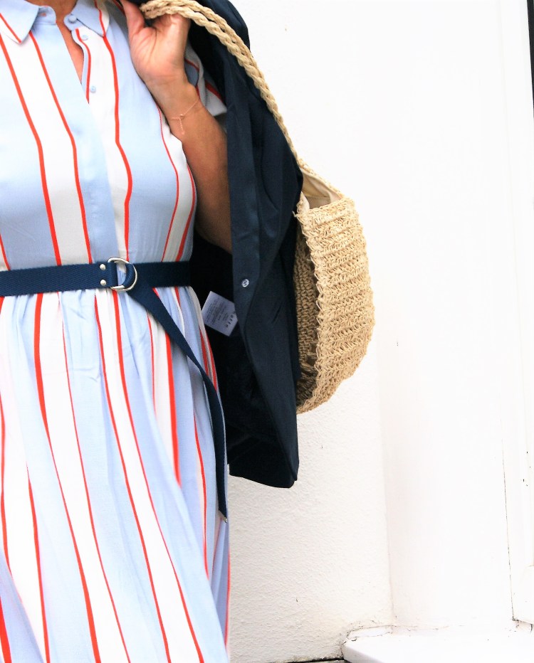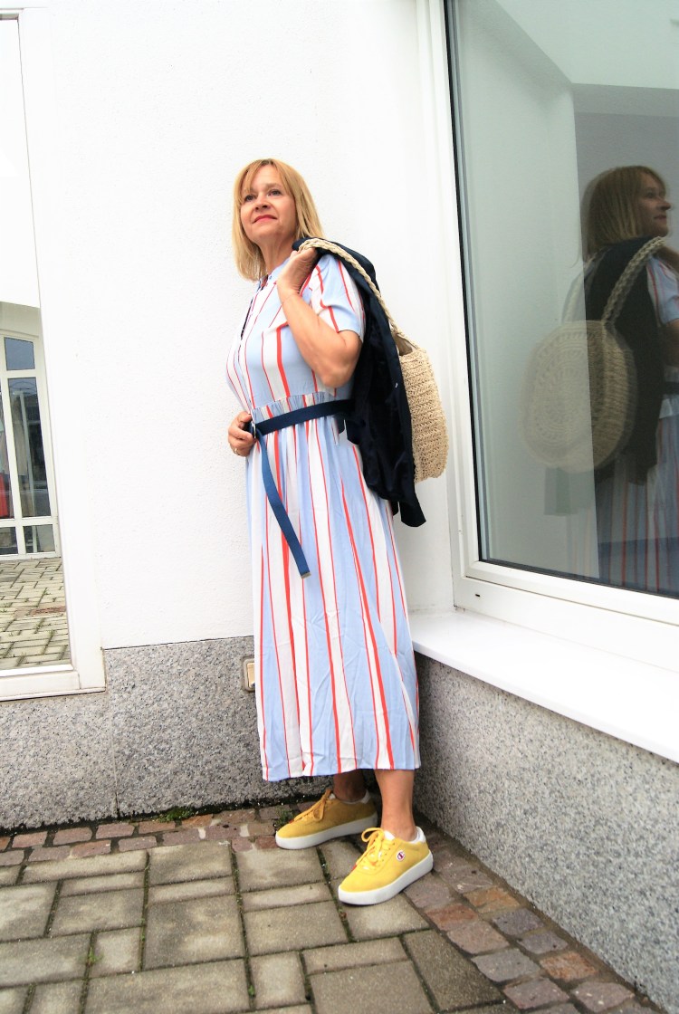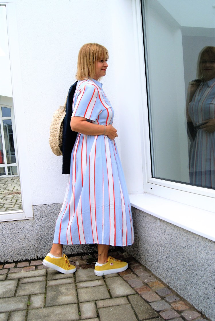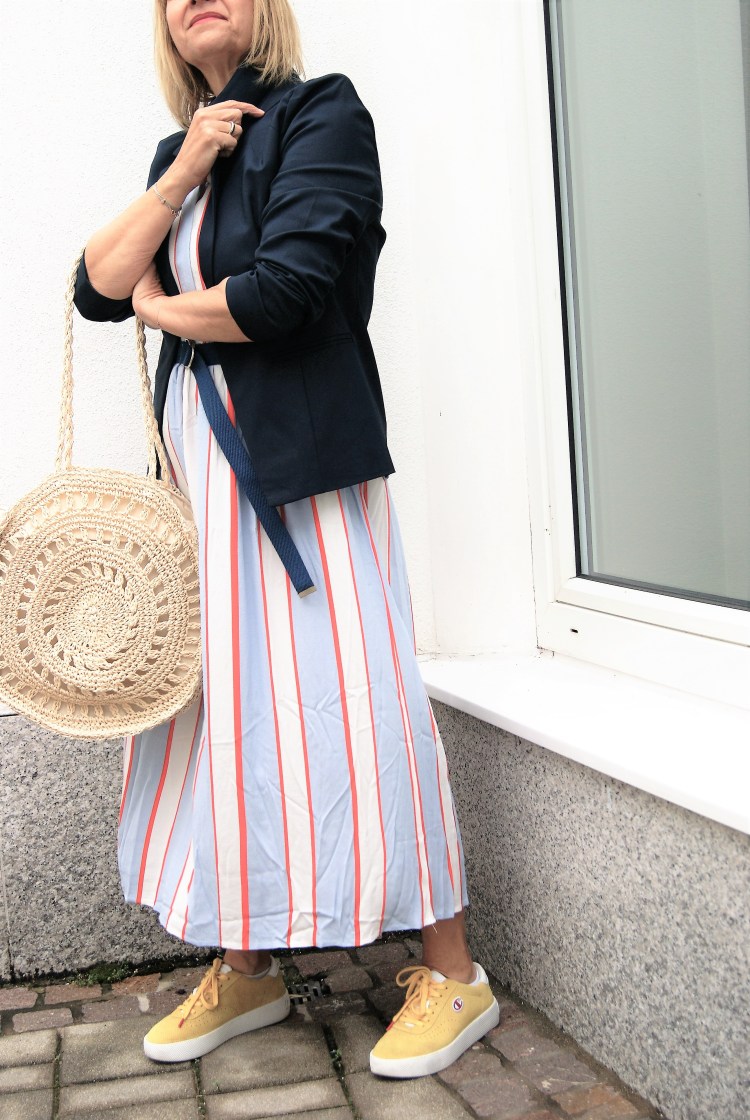 Aber jetzt zum Kleid, das ist dann doch etwas klassischer mit Kragen und vorne geknöpft, aber nichts desto trotz geeignet für einen festlichen Anlass. Ja, ich hab wieder die Sneakers an dazu, aber dafür einen dunkelblauen Blazer drüber. Und einen lässigen dunkelblauen Gürtel – eigentlich ist ein Bindegürtel im selben Stoff wie das Kleid dabei – und anstatt einer kleinen eleganten Tasche ein größere Basttasche, ich bin halt so.
