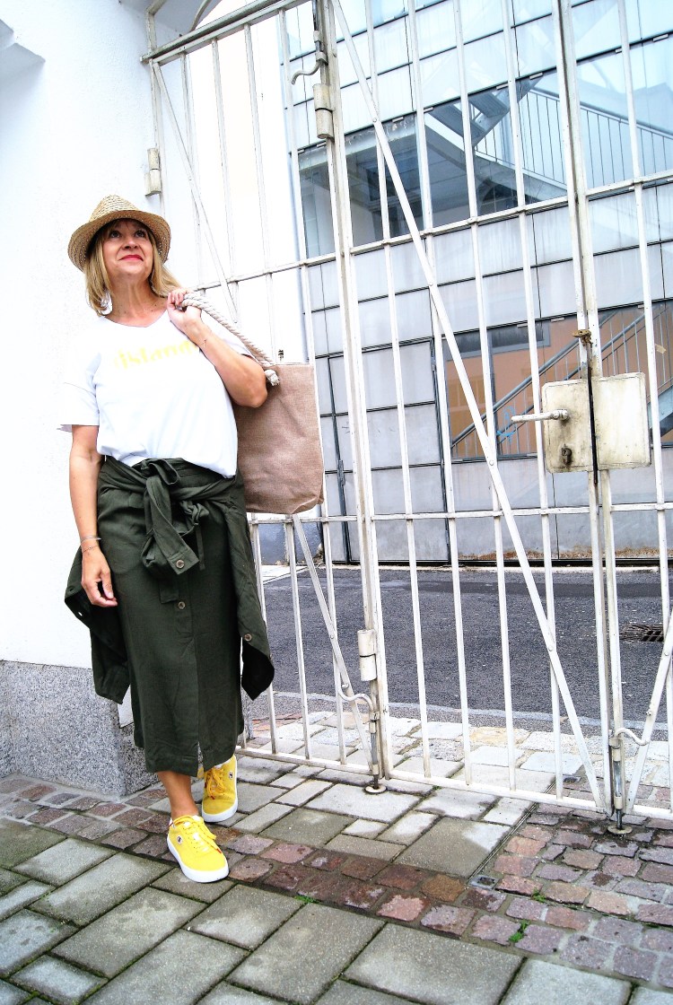 Also, auf die Stadt-Safari hast du mich ja schon begleitet und heute gibt´s eine Ergänzung dazu. Rock und Blusenjacke in khaki, kombiniert mit einem Shirt und gelben Details.