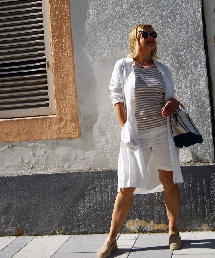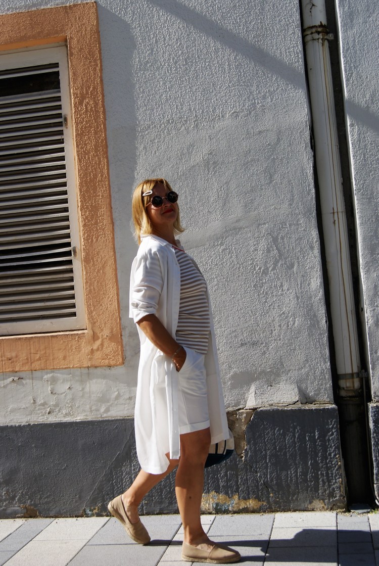 Streifen, sie müssen nicht immer blau/weiß oder rot/weiß sein, nein es darf auch dezent sein in beige mit weiß und für den Farbklecks sorgt der zarte orange Streifen am Halsbündchen. Für drüber, denn auch wenn es heiß ist darf es ein bisschen mehr sein, zumindest bei mir, hab ich den „weißen Kittel“ den ich dir auch hier schon gezeigt habe, gewählt.