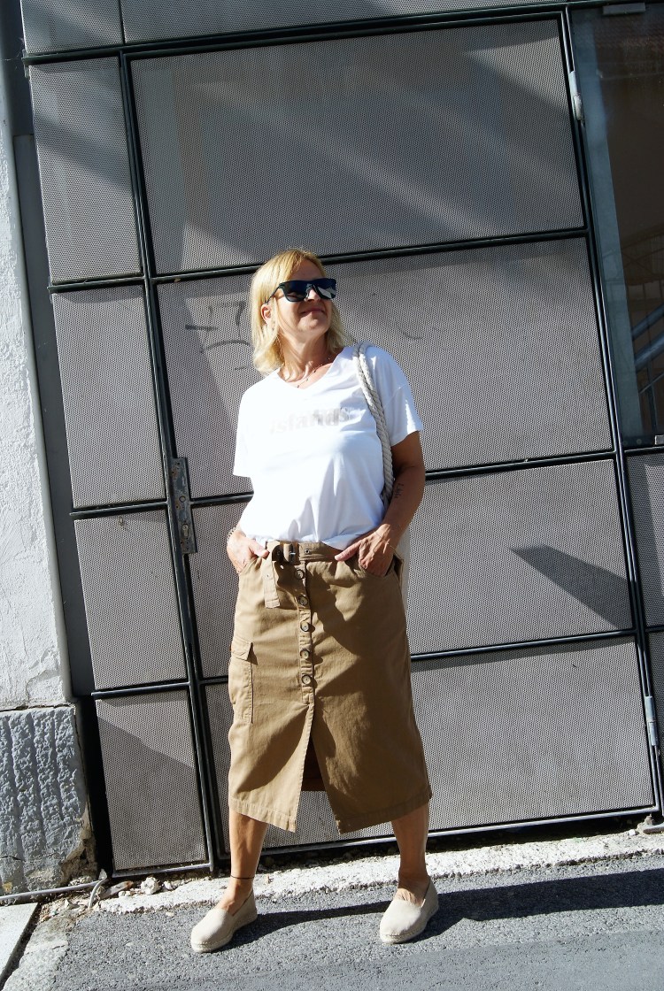 Nein , ich hab für dich einen Cargorock und der ist finde ich in einer der typischen Farben für diesen Stil – cognac. Ich liebe ja diese Farbe und ich sag es dir gleich, die ist ein Vorreiter für den Herbst. Falls du dich erinnern kannst, diese Bluse und das Kleid haben es schon im Sommer erahnen lassen, dass die Naturtöne wieder kommen. Und so ist es auch – ich freu mich! Die kannst du super kombinieren.