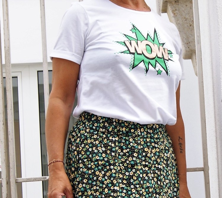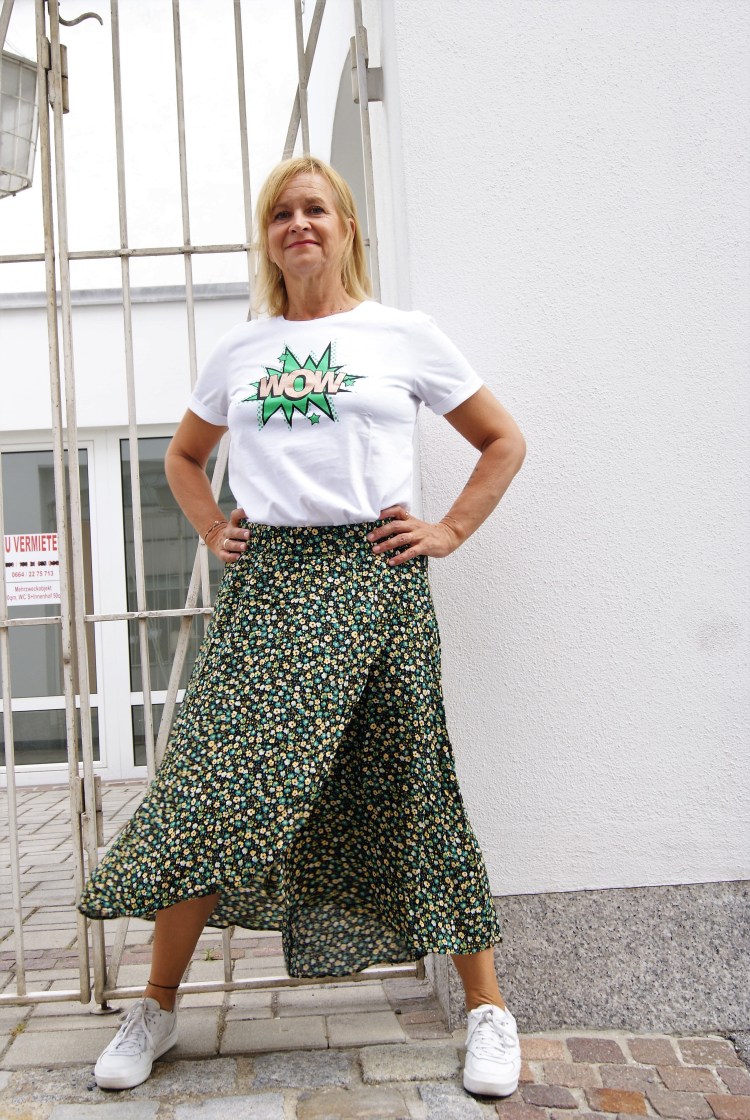 Noch interessanter wird es wenn ein Statementshirt auf einen geblümten Rock trifft, was für eine Kombi. Bestimmt nicht jedermanns (frau) Geschmack, aber doch mal ganz was anderes.