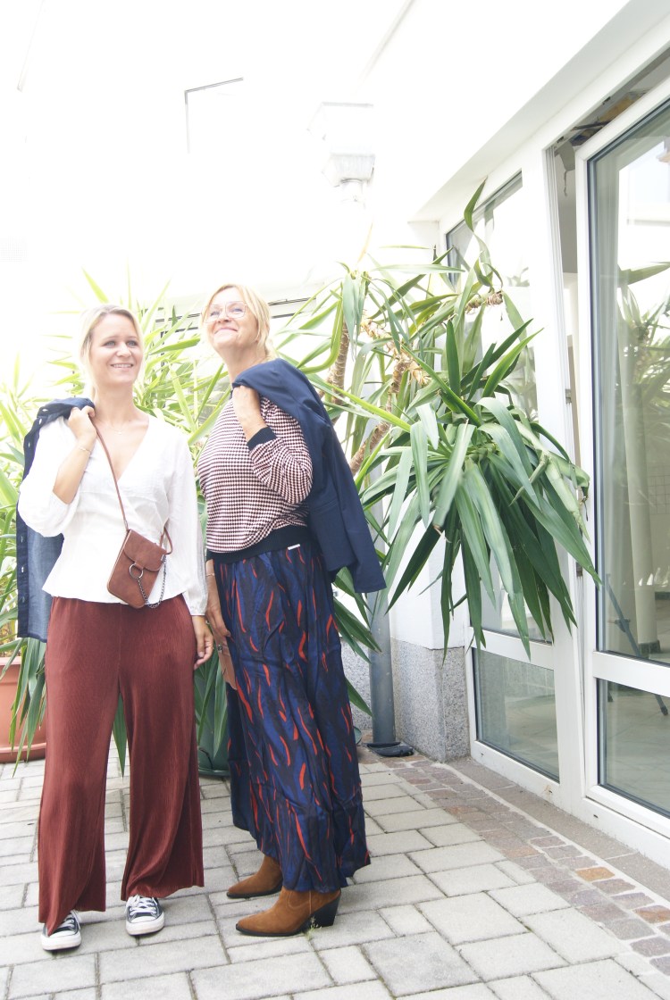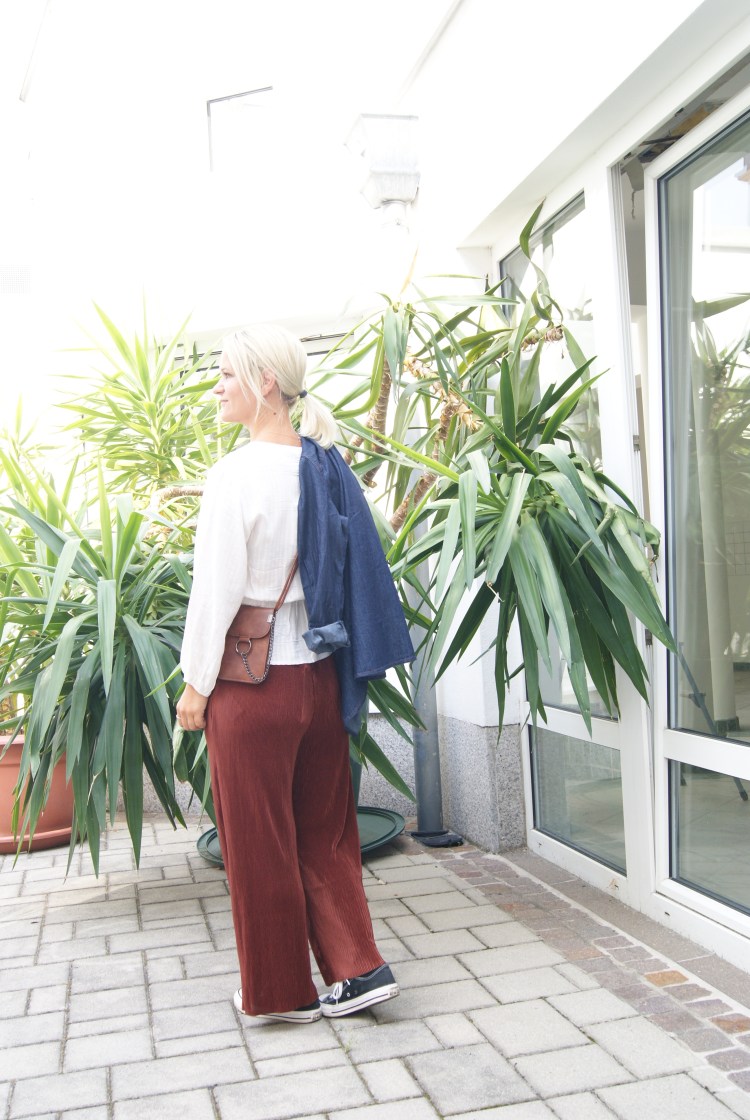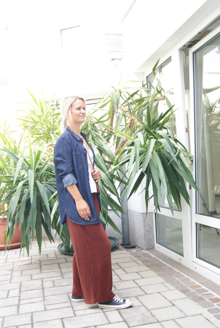 Heuer gibt´s wieder Jeanshemden und das auch noch in dem coolen Dunkelblau, das finde ich super, denn zu diesem dunklen Blau kann man auch ein helleres Jeansblau kombinieren und das schaut mega aus. Viki hat sich jedoch für eine Culottes in rostrot (Kastanie) entschieden. Und sie trägt das Hemd als Jacke und darunter eine helle Bluse – auch diese Kombi steht ihr echt gut.