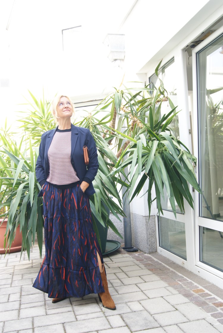Den Rock, für den ich mich entschieden habe, hast du sicher schon auf Instagram  (ich würde mich natürlich sehr freuen wenn du mir auch dort folgst) gesehen, den hatte ich schon 2x gepostet. Da sowohl dunkelblau als auch schwarz in der Musterung vorkommt ist er ganz einfach und individuell zu kombinieren. Obwohl der Blazer mit dem Streifen auf der Seite halt schon perfekt dazu ist.