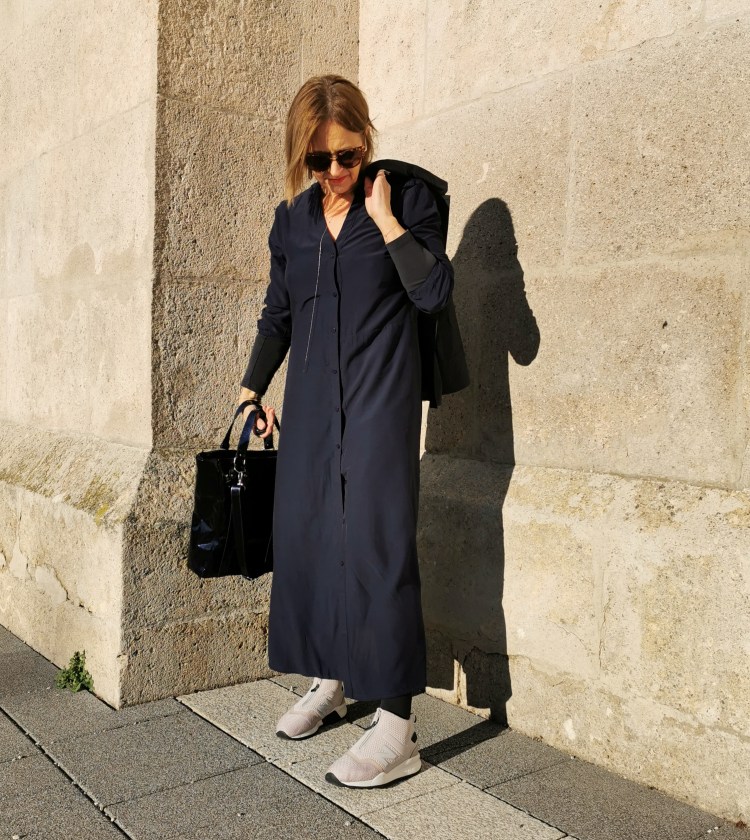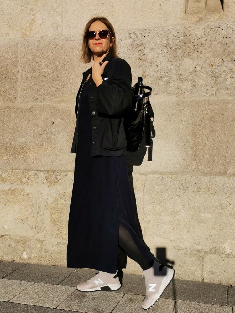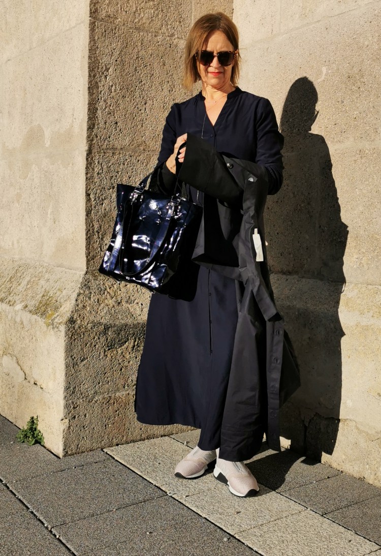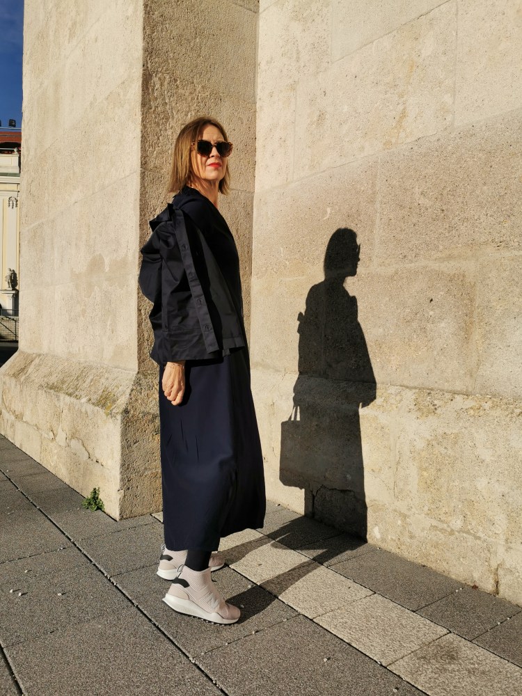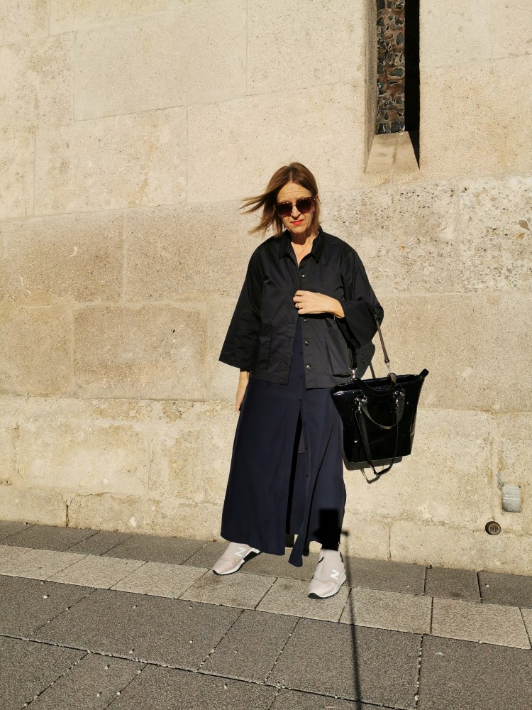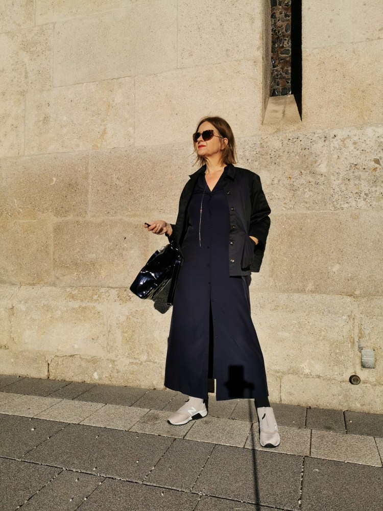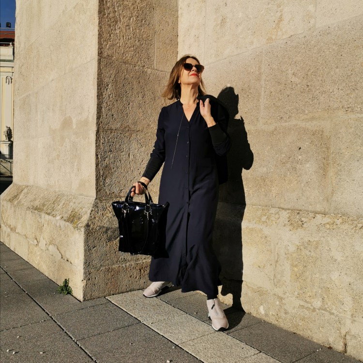 Schlicht, einfach, lang, dunkelblau – die Beschreibung meines Kleides und es ist Liebe auf den ersten Blick gewesen, das ist ein Teil, dass bleibt. Dazu kombiniert hab ich die Jacke im Kimonostyle, mit verkürzten weiten Ärmeln und eigentlich einem ganz anderen Blauton, nämlich in Mitternachtsblau. Also genauso wie bei den Beigetönen von voriger Woche hier haben wir die Schattierungen in den Blautönen und ich mag es so. Ich kombiniere auch dunkelblau gerne mit schwarz, was für manche gar nicht geht, ich find es cool.
