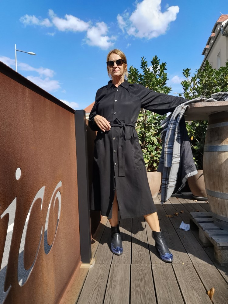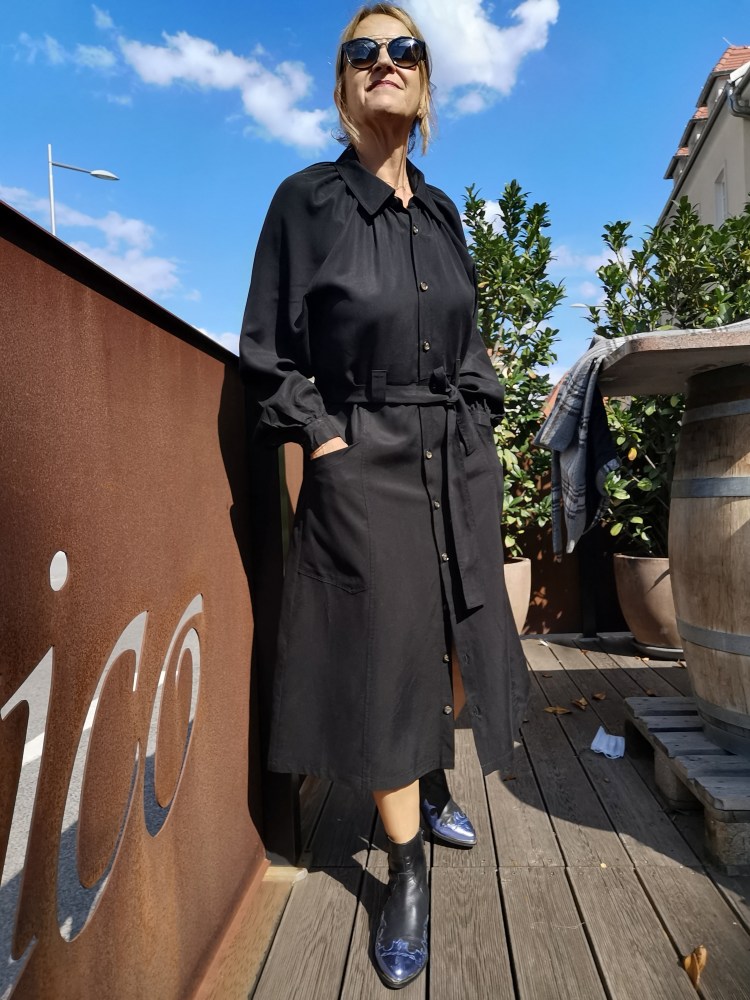 Mantelkleider hatte ich ja schon einige und doch komm ich jedes mal von Neuem ins schwärmen, bei diesem ist es die schöne Faltenlegung rund um den Kragen und die betonten Ärmel, von der Qualität ganz zu schweigen. Das Kleid ist aus einem schweren Lyocell und fallt daher mega schön. Die Vorteile eines Mantelkleides brauch ich, glaube ich, gar nicht mehr beschreiben, denn ich hab es schon so oft erwähnt, dass diese Kleider einfach ganz vielseitig zu kombinieren sind.