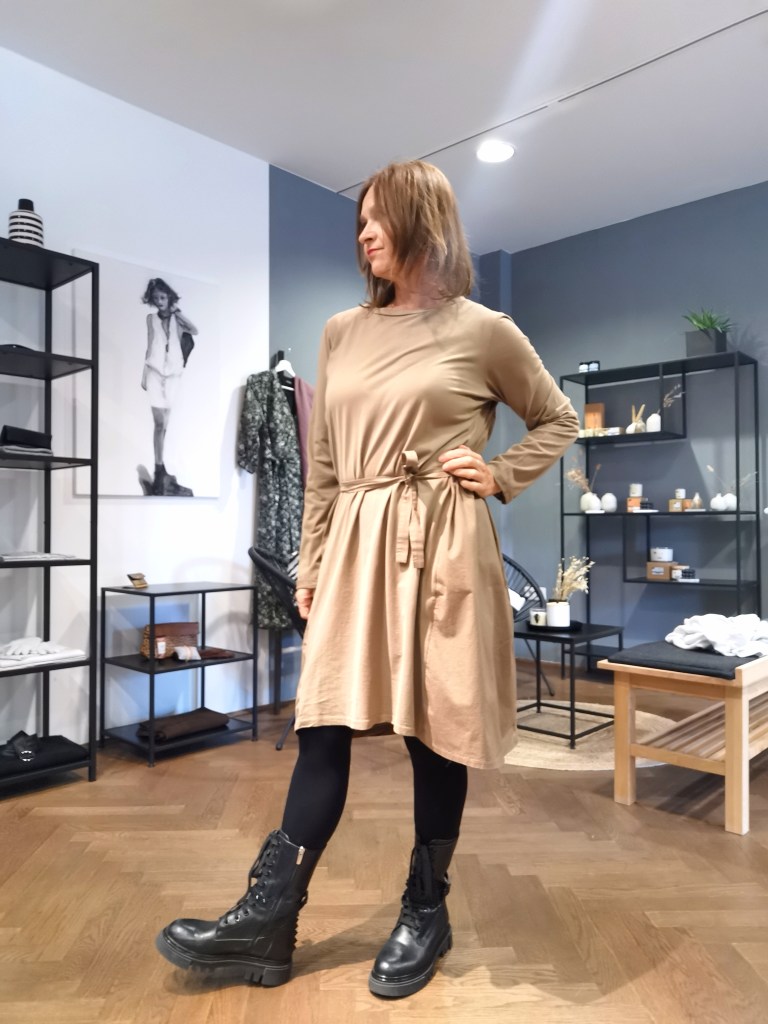 Dieses beige Kleid hat einen Bindegürtel der entweder vorne …….