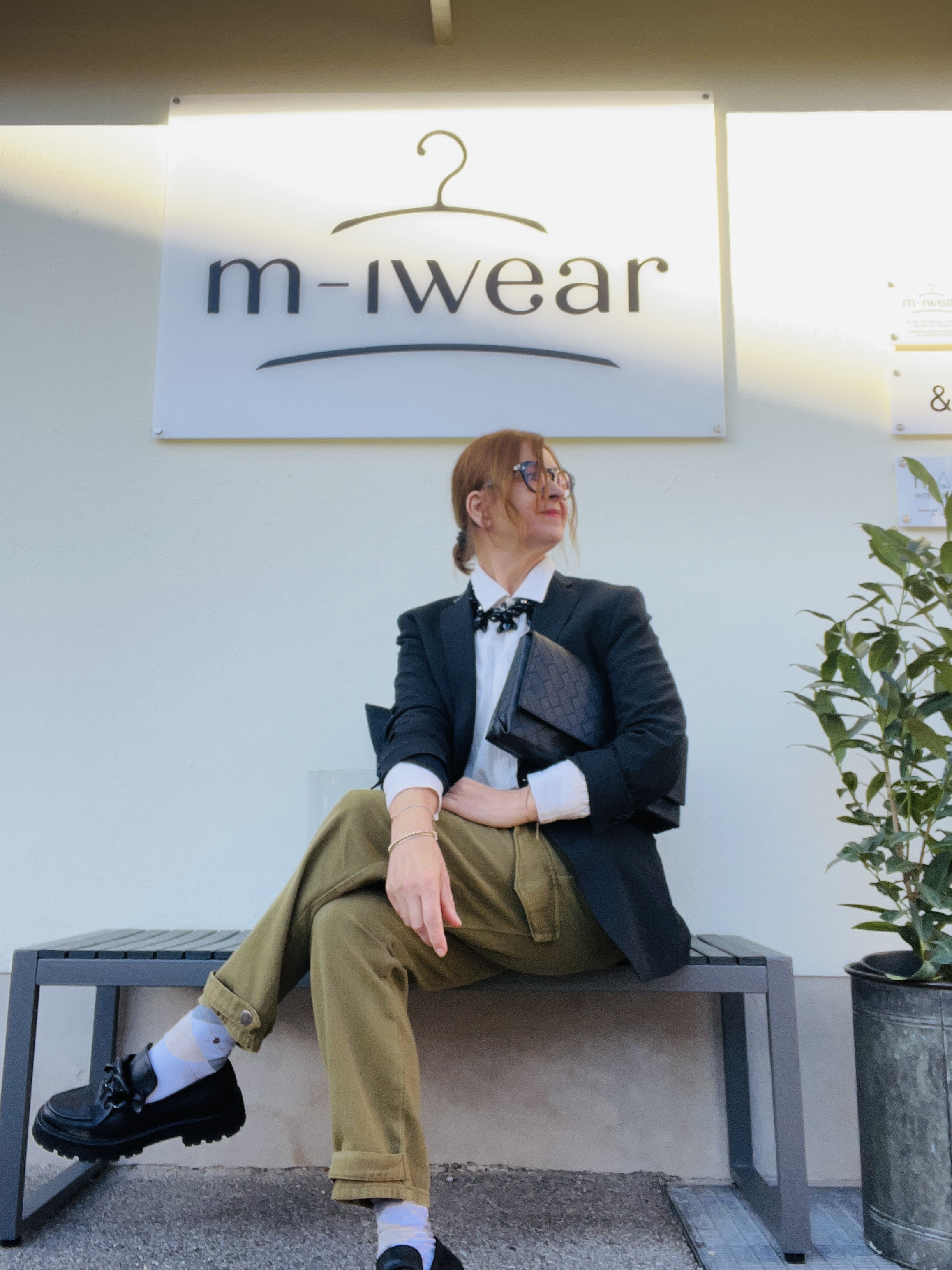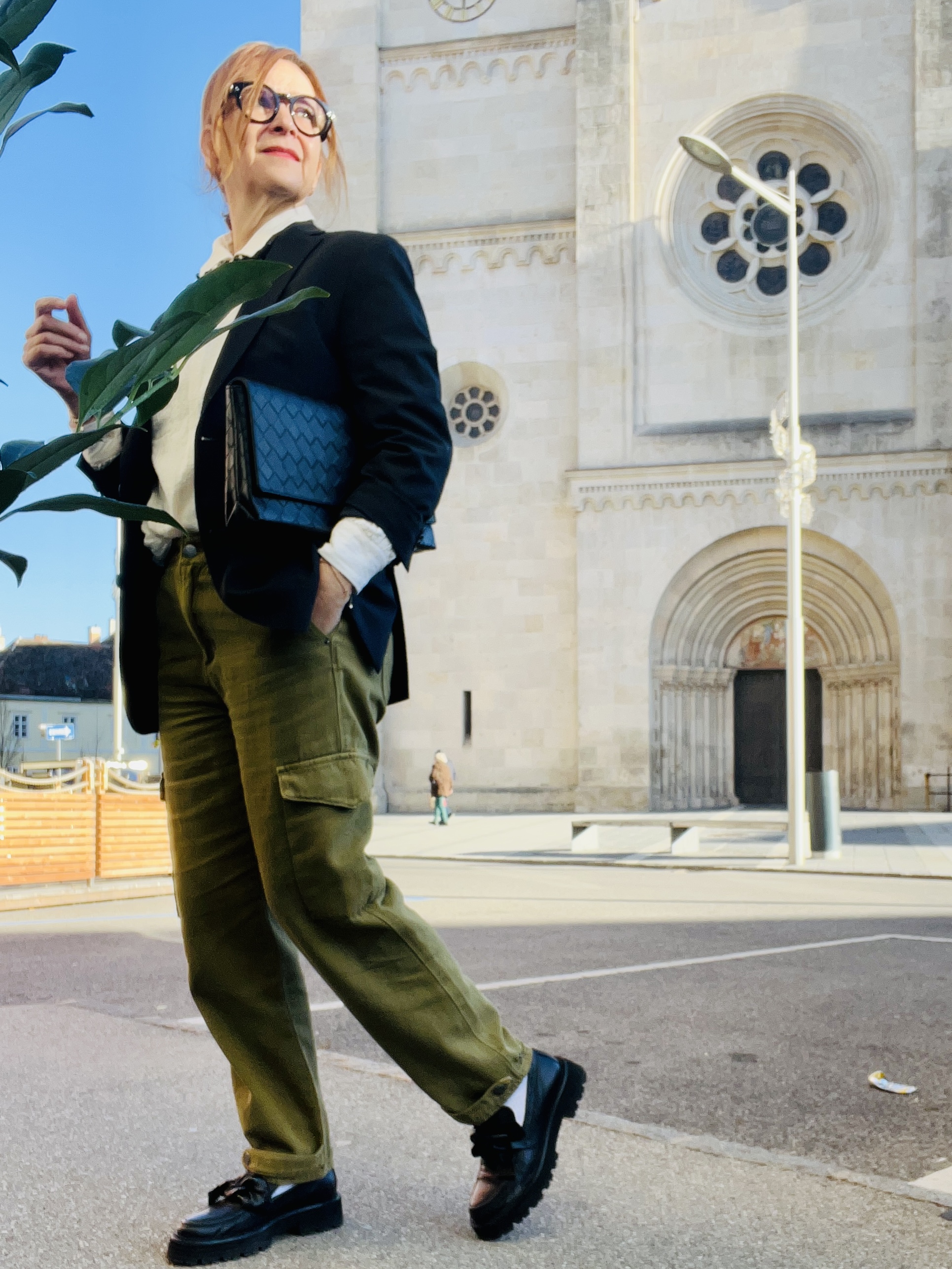 Auf dem ersten Foto hab ich eine ganz sportliche, olivgrüne Cargopants im Stilbruch mit eleganterem Blazer, hochgeschlossener Bluse und schwarzen Loafers kombiniert. Diese Statementkette ist aus meinem Fundus und sicher schon 15 Jahre alt, aber zu diesem Outfit finde ich passt sie perfekt.