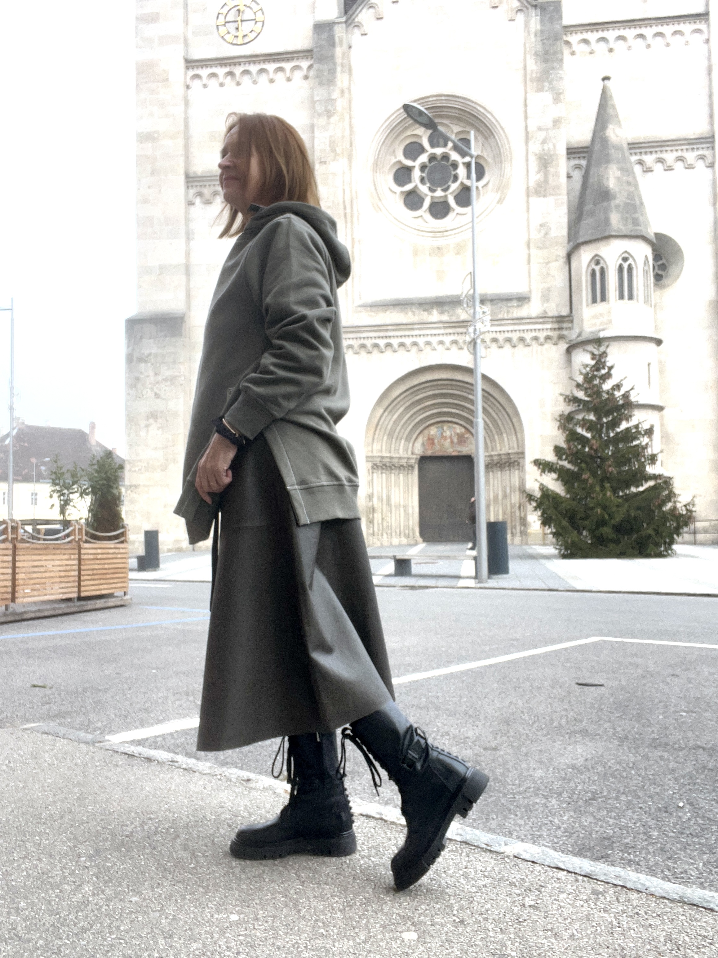 Hoppla, schon das nächste grüne Outfit in oliv. Wobei ich dir verraten darf, das ist im SALE – also schnell sein, es sind nur mehr Einzelstücke da, und so lässig wie das ausschaut, sind die auch bald weg. Ich mag diesen Look und da haben wir auch schon wieder den Stilbruch mit eleganterem Rock und lässigen Hoodie.