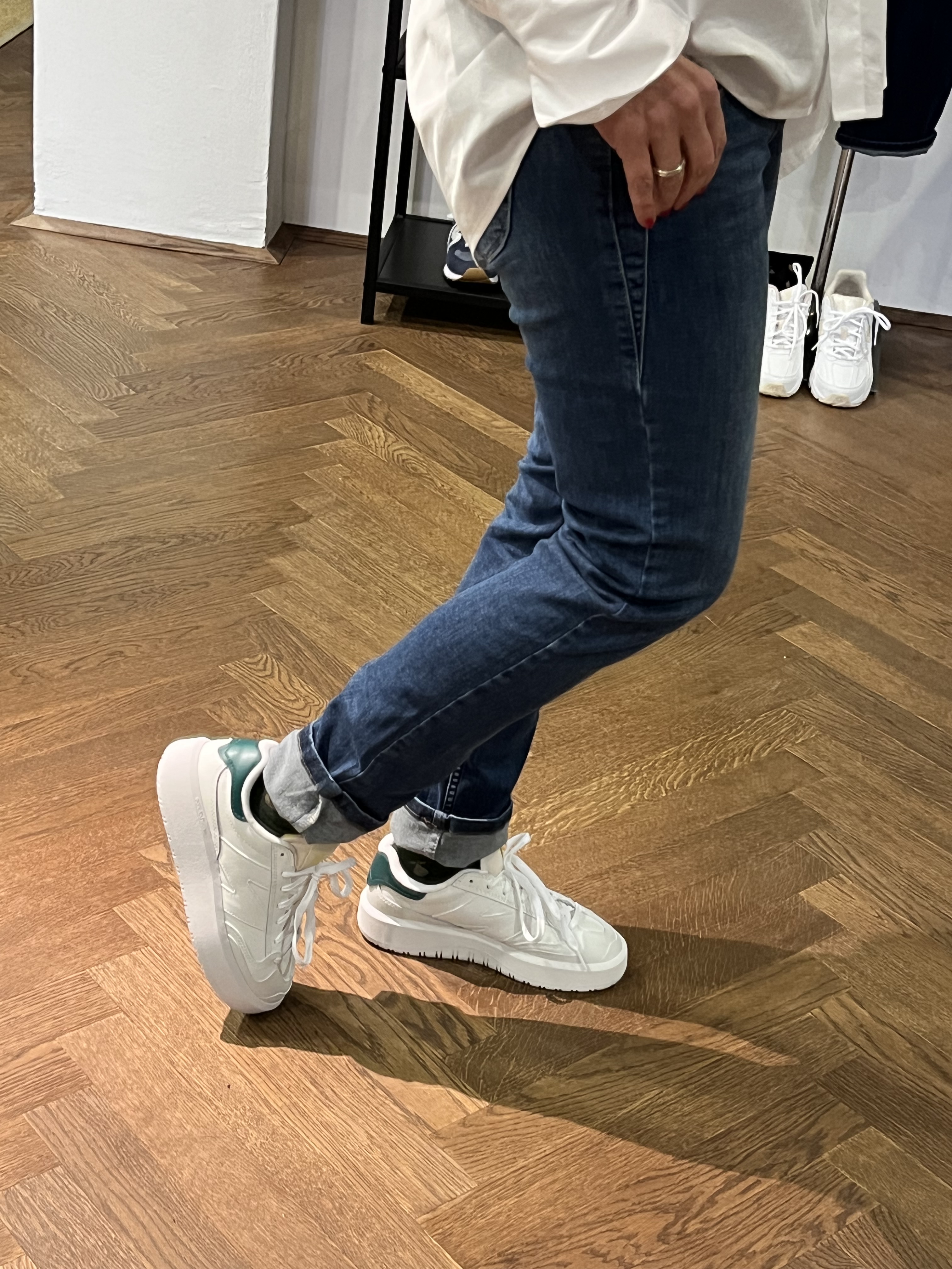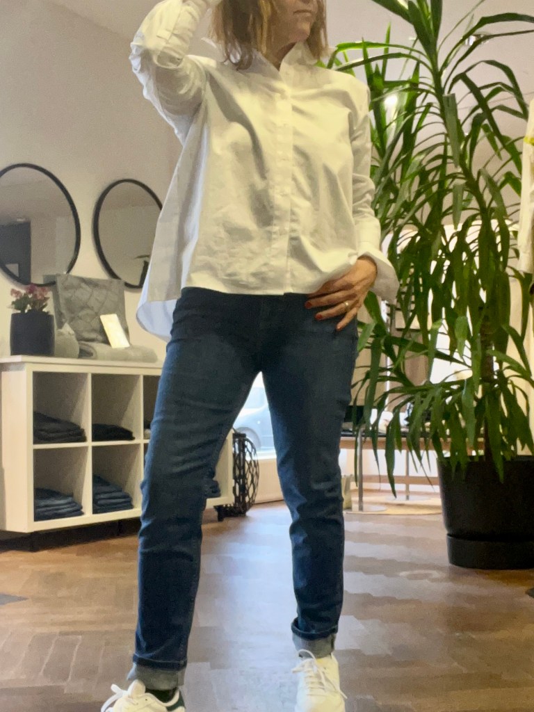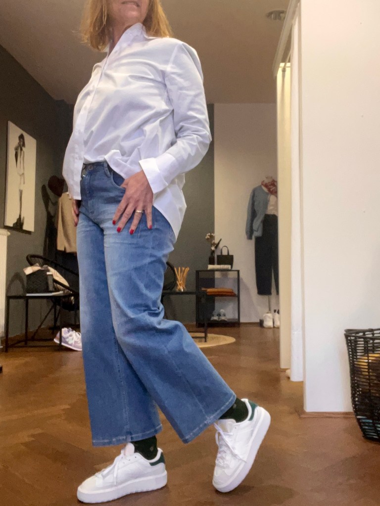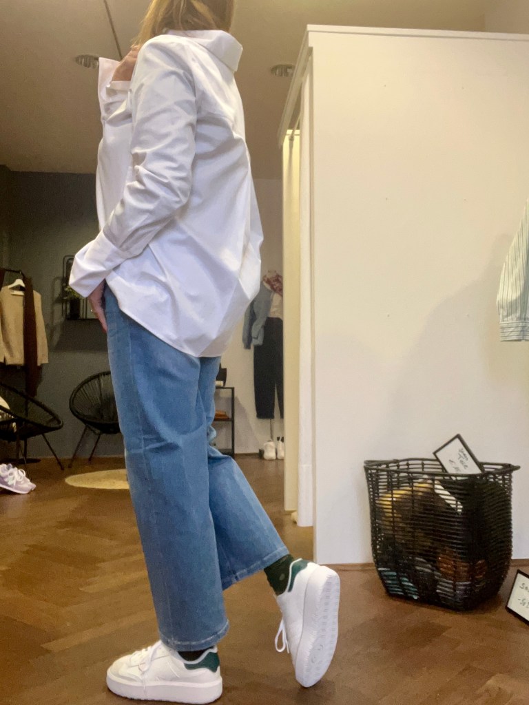 Ich hab zu den Jeans immer die selbe weiße Bluse – die übrigens auch neu eingelangt ist – an. Die hat ganz breite Manschetten, die du auch gerne aufstricken kannst und hinten eine Falte. Meiner Meinung nach hat sie eine gute Länge, die vielseitig zu kombinieren ist. Auch die Sneakers – ebenfalls von der neuen Kollektion hab ich immer gleich gewählt.