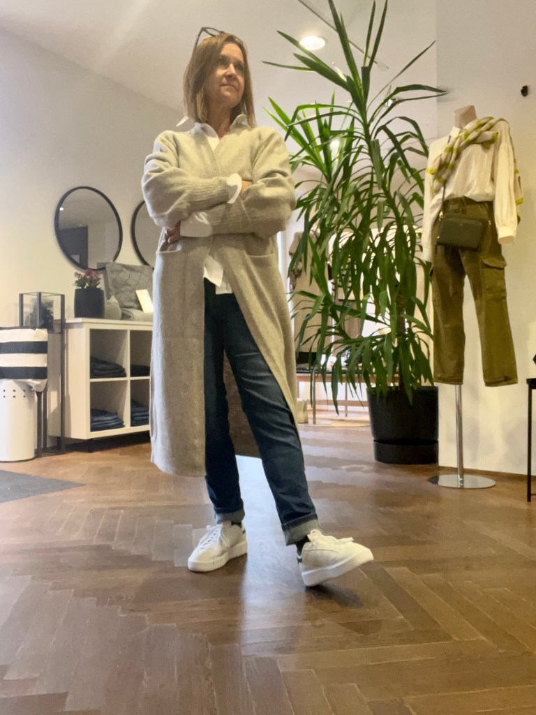 Die 3. Jeans ist an und für sich ganz klassisch „slim“ mit einer mittleren Bundhöhe. Auch die Farbe ist so mitten drin, nicht zu hell nicht zu dunkel. Die Beinlänge kann auch gerne aufgestrickt werden bei dieser Jeans. Bei so engen Jeans mag ich gerne auch mal einen langen Cardigan dazu. Dieser ist so grey/melliert ich hab aber auch einen schwarzen wenn du möchtest. Die gehen auch halt das ganze Jahr über, im Sommer am Abend über das Kleidchen herrlich zum Reinkuscheln.
