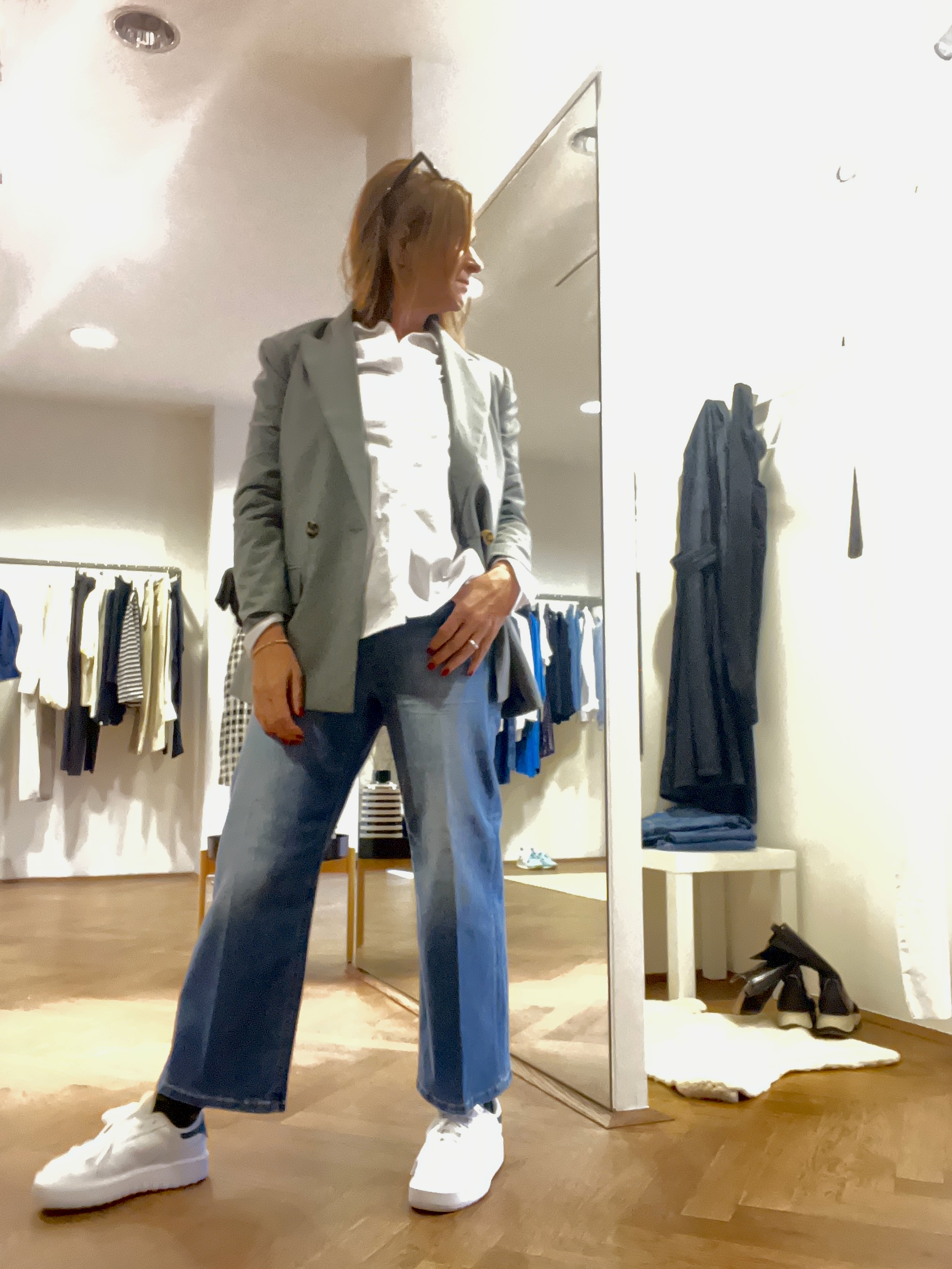 Dieses Jeansoutfit hab ich mit einem Oversizeblazer in einem schönen salbeigrün ergänzt, Blazer sind ja der Renner.