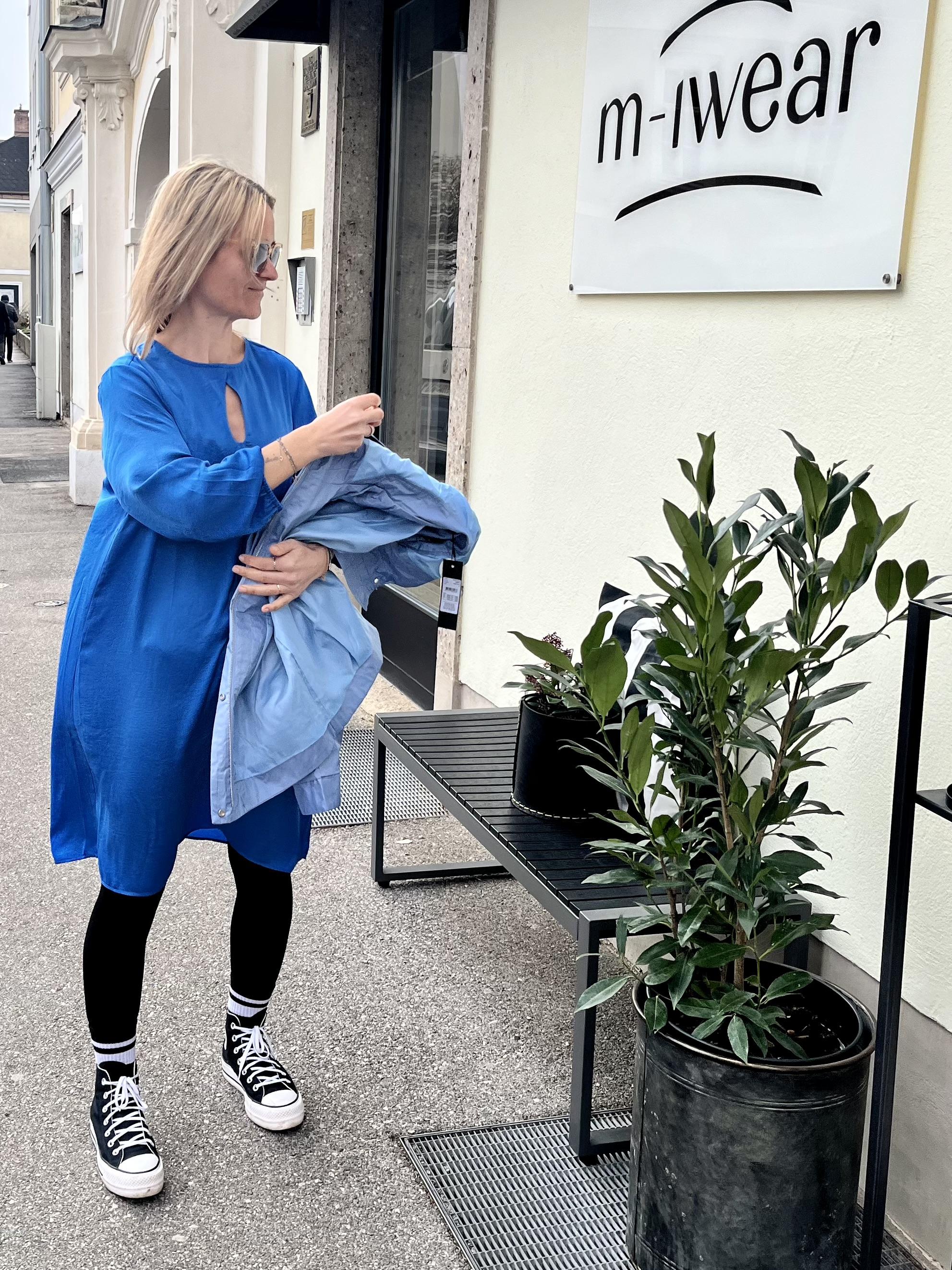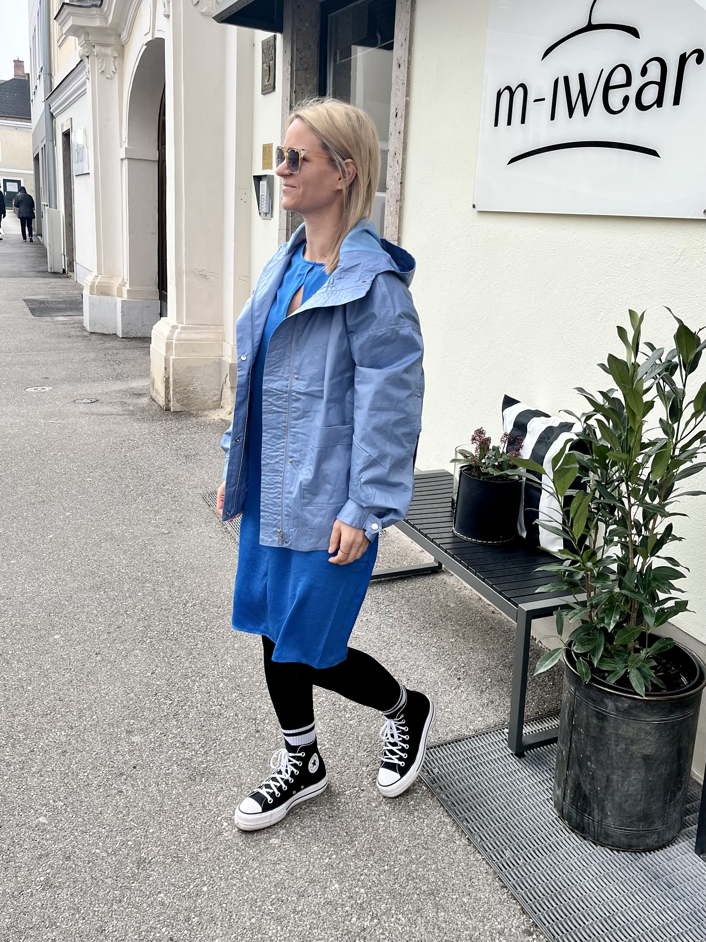 BLAU ist heuer ein großes Thema, alle Varianten an Blautönen gibt´s vom Shirt über die Hose bis zum Kleid, ich glaub, für jede etwas dabei. Das Kleidchen, dass Viki hier trägt, kann jetzt schon gut über eine Hose oder Jeans getragen werden, die sportliche Übergangsjacke (die ist etwas beschichtet und ideal gegen Wind und Wetter) ergänzt den Look und man hat einen coolen Stilbruch.