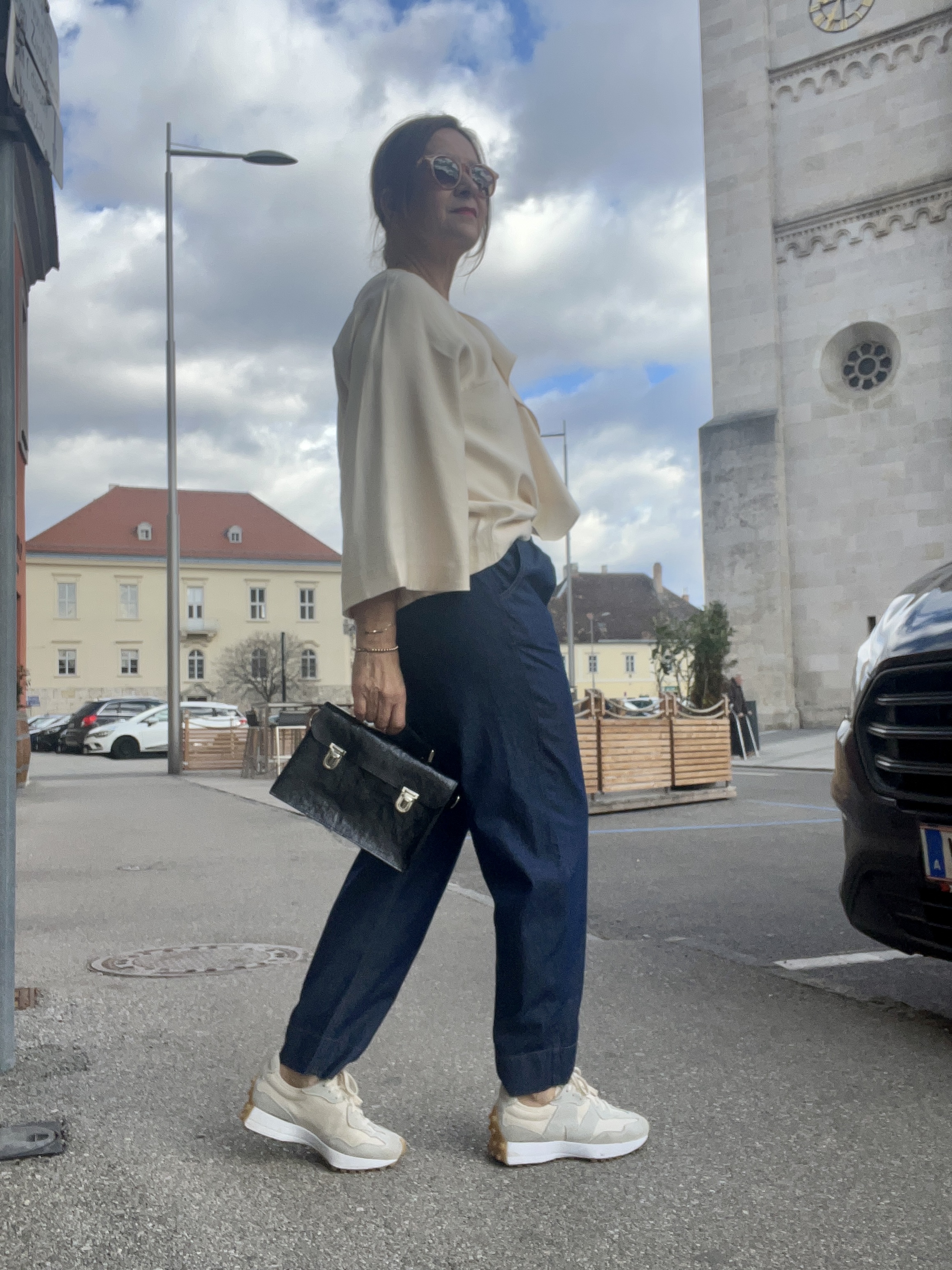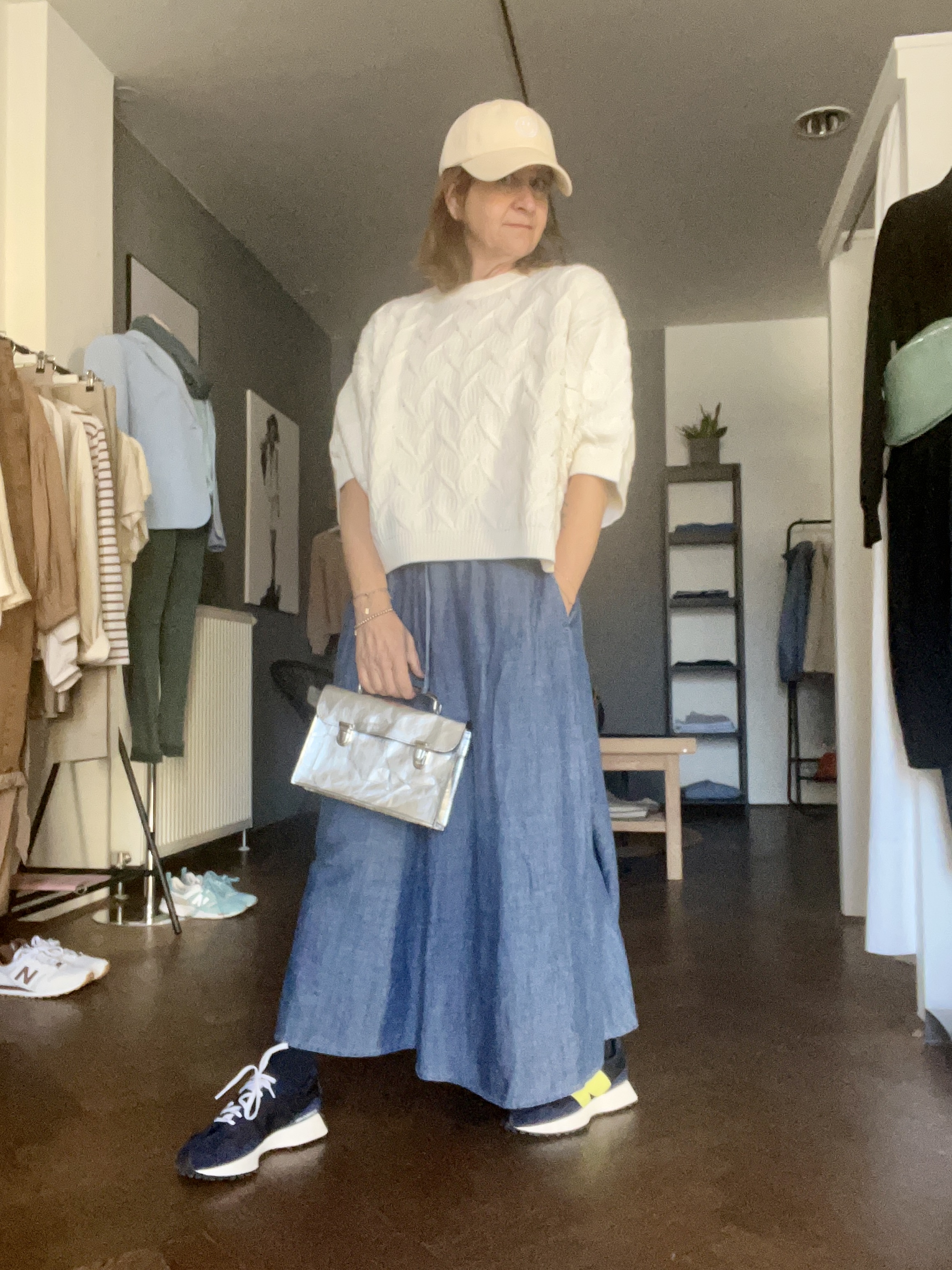 Der Jeans-Hosen-Rock ist ideal für die warmen Sommertage (geht jedoch jetzt mit einer Strumpfhose auch) der Stoff aus Lyocell und Leinen ist ganz leicht und angenehm zu tragen. Ich hab ihn hier mit einem Oversizepulli kombiniert. Die kleine „Schultasche“ aus Holzleder ist auch neu eingetroffen. Accessoires sind halt immer wieder ein Hingucker – egal ob es jetzt eine Kappe mit Smiley oder eine nette Tasche, bunte Armbänder oder ein Tuch ist.