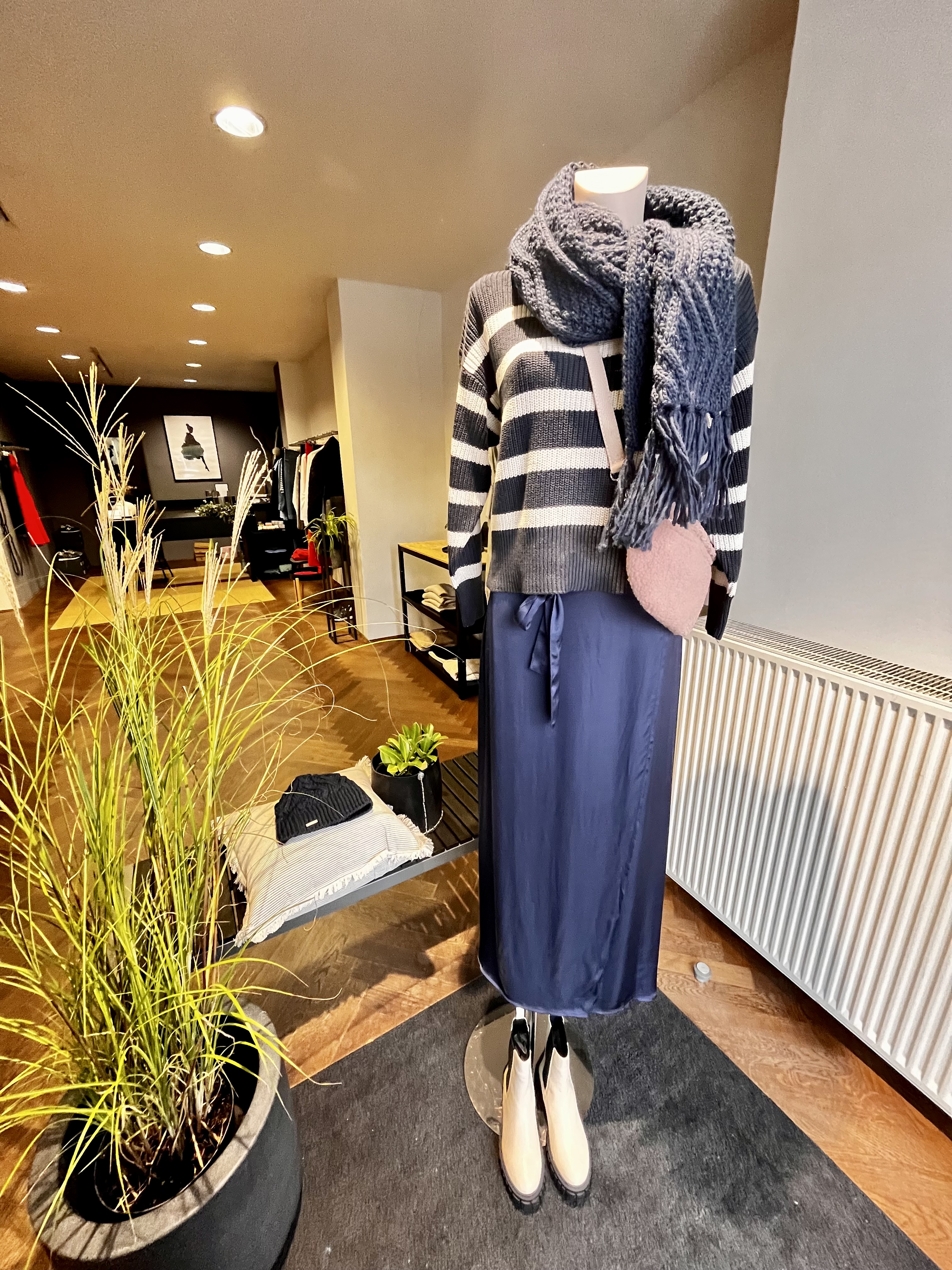 Dunkelblau geht doch immer, der lange Satinrock kombiniert mit dem grob gestrickten Streifenpulli ist die perfekte Kombination aus zwei sehr unterschiedlichen Materialen und dieser Mix macht es auch aus.