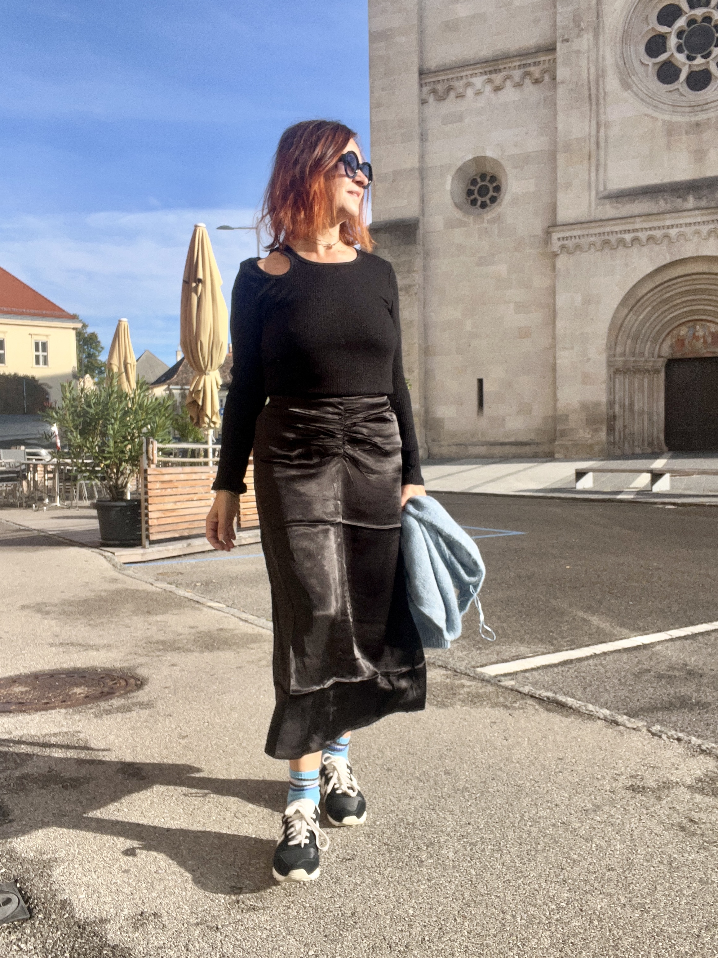 Dieses Outfit ist erst eingetroffen als ich auf Urlaub war (und wurde gleich fotografiert und nicht gebügelt – sorry) . Wieder ein Satinrock, der jedoch nicht so lange ist wie der dunkelblaue und ist dieser am Bauch oben gezogen, d.h. da passen alle Vanillekipferl hinein ohne dass es jemanden auffällt. Das Rippstrickshirt mit dem Cutout an der Schulter ergänzt die Kombi für mich perfekt – also ganz perfekt für mich ist es erst mit den Sneakers und den Söckchen 😉