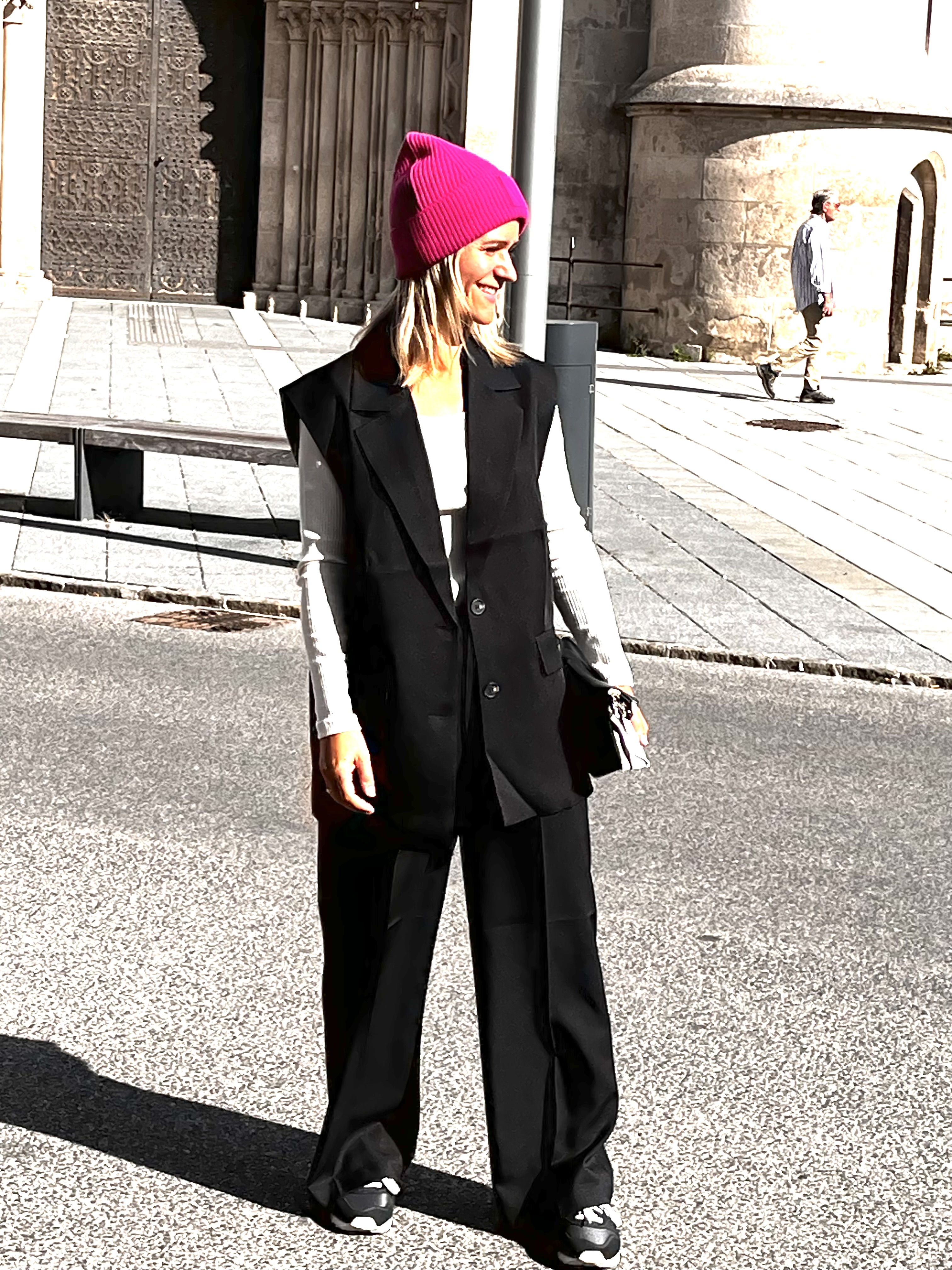 Viki hat hier eine Kombi aus einem oversize Blazer ohne Arm und einer gerade geschnittenen Hose an – (nicht verraten, das ist ihr Geburtstagsoutfit) Für diejenige, die etwas größer ist, wird die Hose dann bis zum Knöchel reichen, aber ich finde beide Längen lässig.
