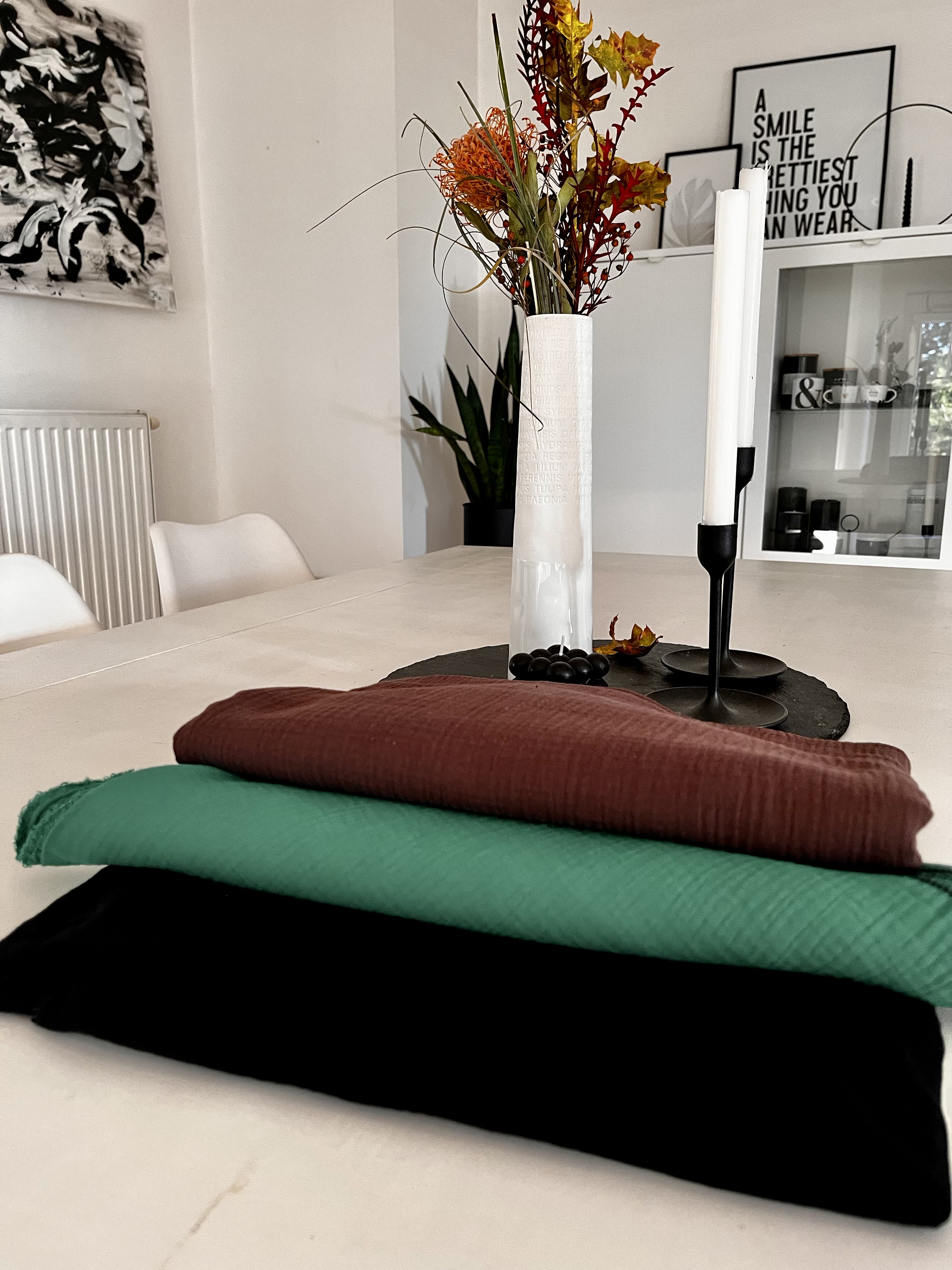 In meinem Urlaub hab ich wieder ein paar Musselintücher in neuen Farben genäht – dieses mal sind sie auf zwei Seiten etwas ausgefranst und auf den anderen zwei Seiten geändelt. Auf den Fotos schaut das Grün etwas gedämpft aus, es ist aber ein richtig schönes und kräftiges Grün.