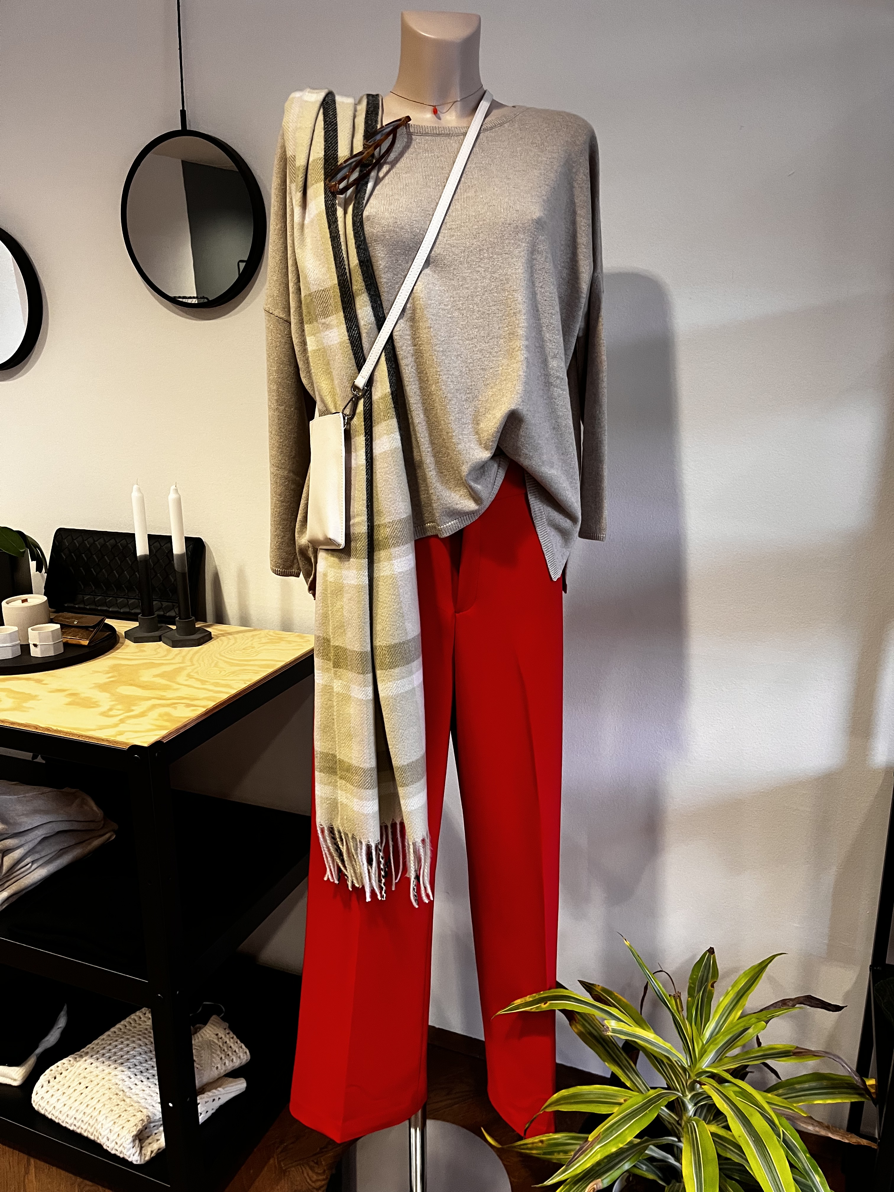 Hier hab ich den Pulli – der oben mit dem Karorock abgebildet ist und die rote Hose von oben kombiniert. Was gefällt dir besser – Ton in Ton oder doch so mit Naturtönen?