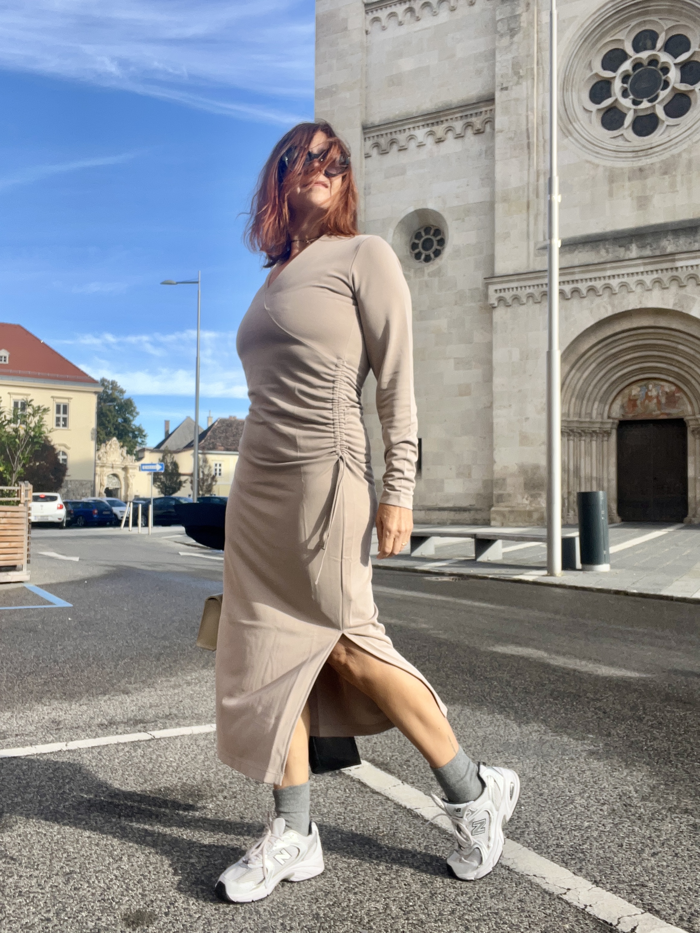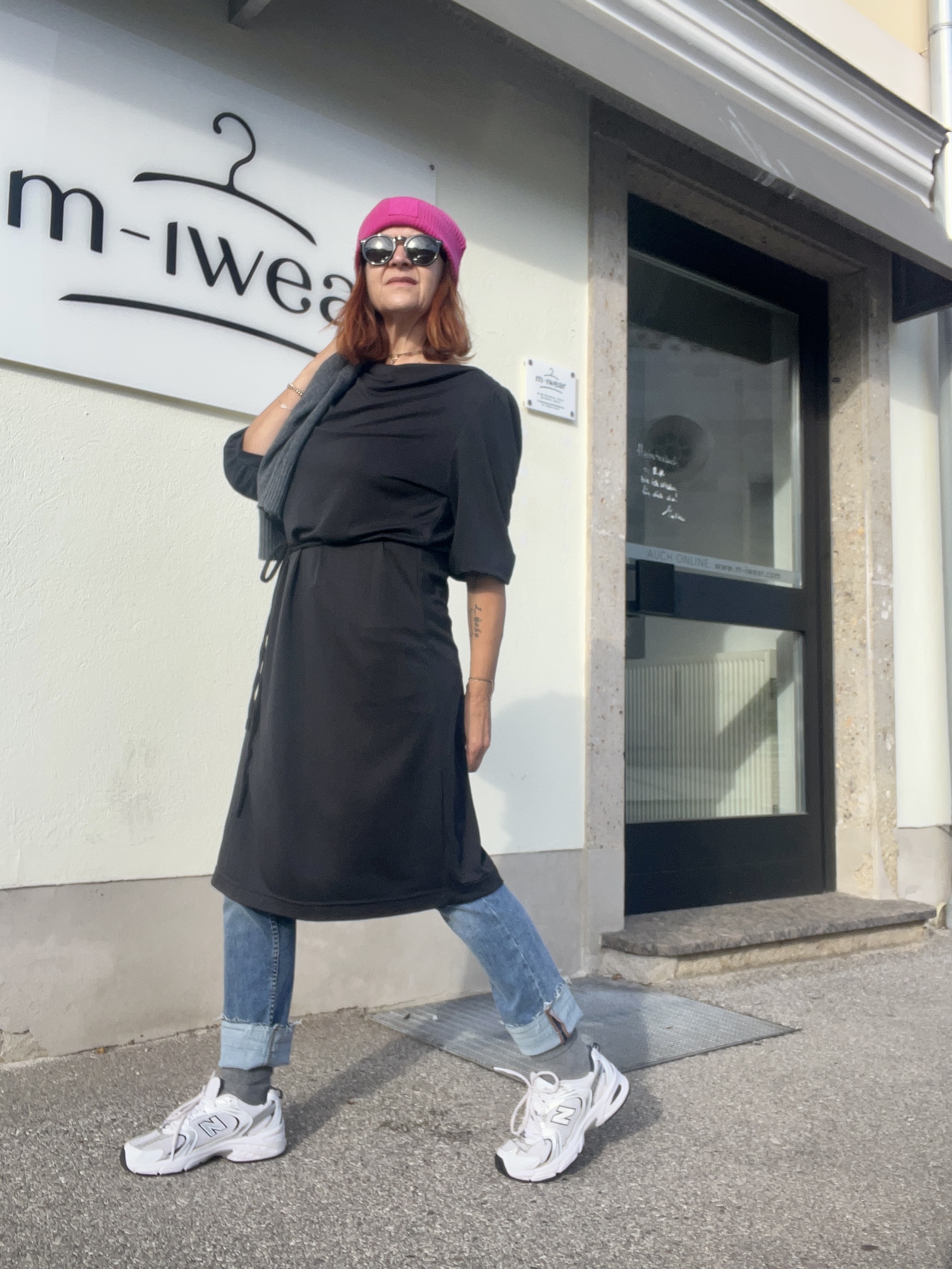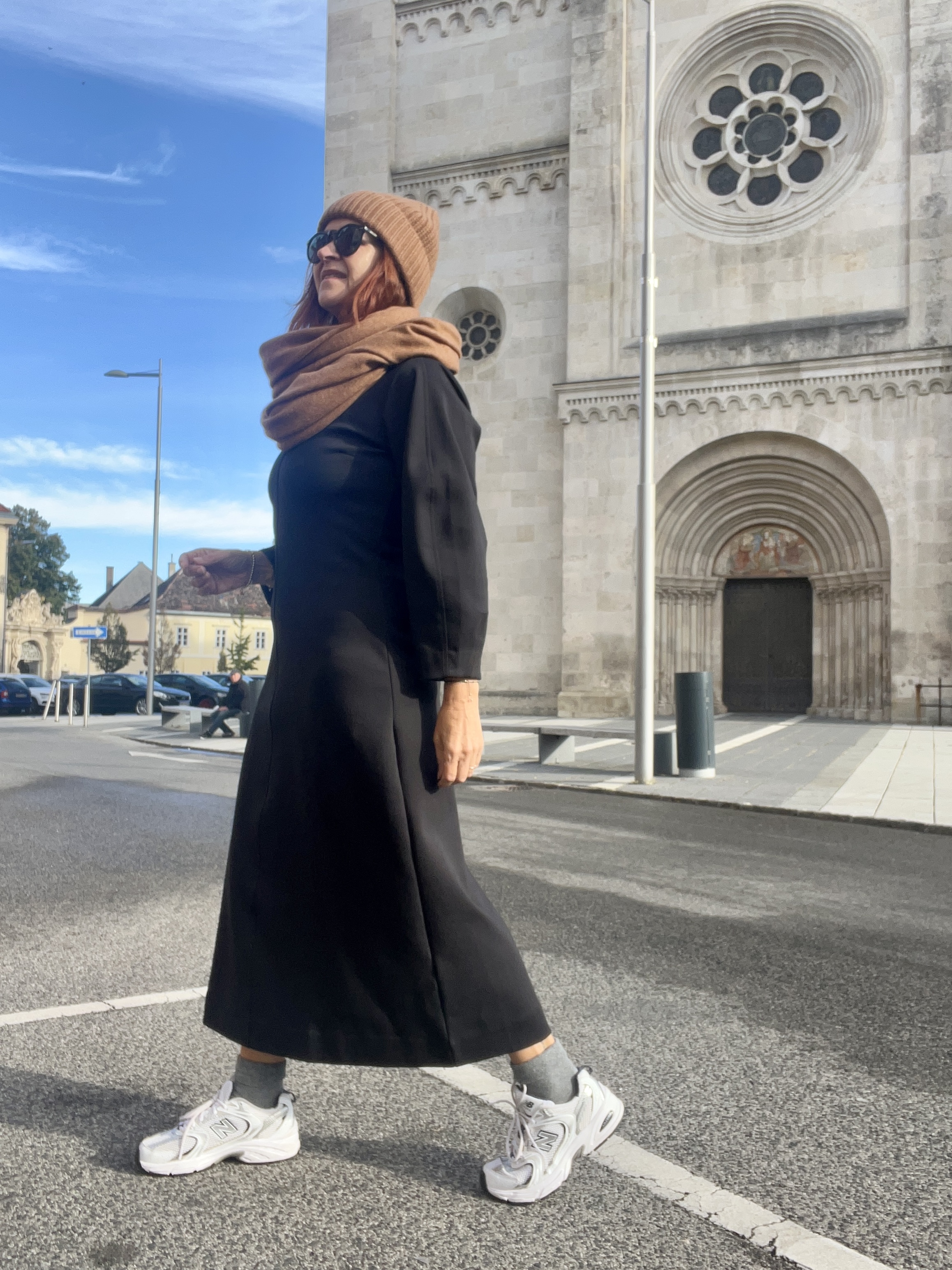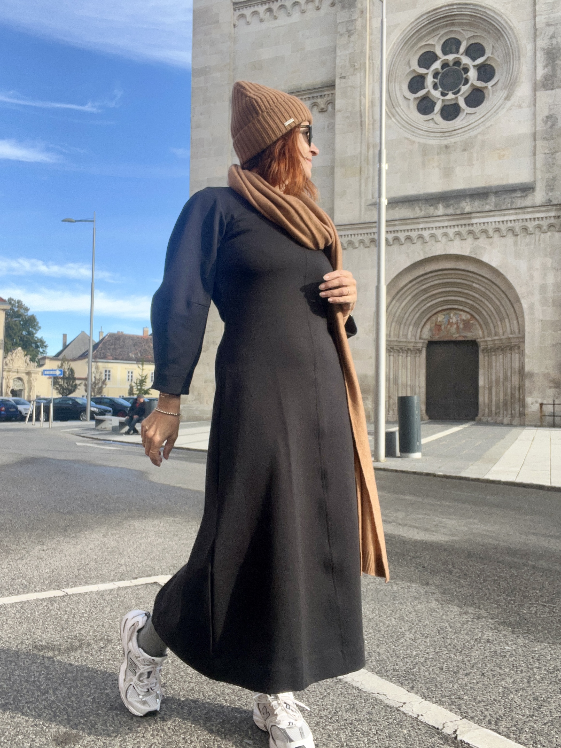 Kombiniert mit Cashmere Haube + Schal und den Sneakers ist das Kleid „alltagstauglich“ – mit einer schönen Stiefelette und einer Clutch bist du bestens gekleidet für die Weihnachtsfeier.