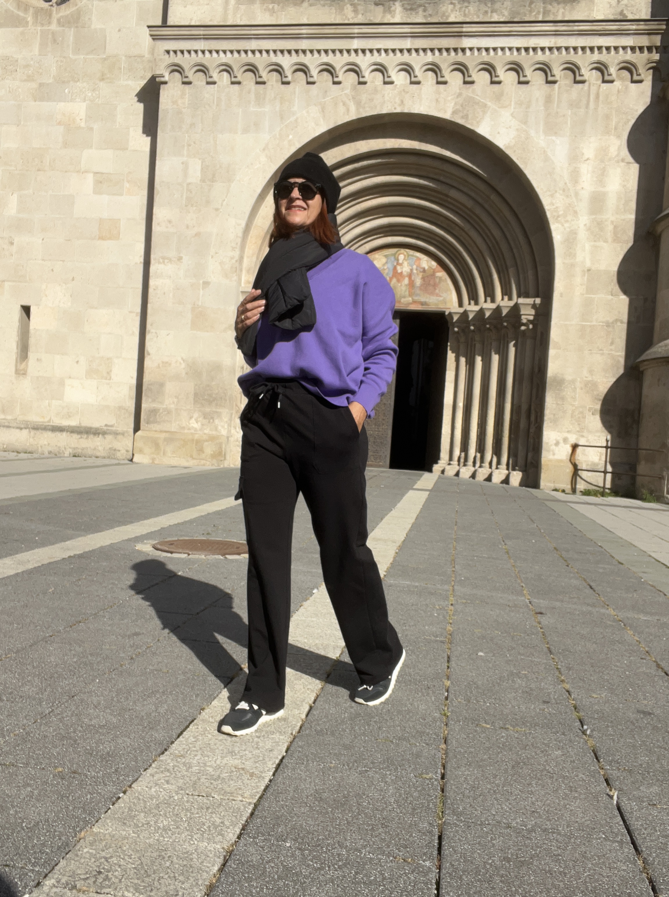 Diese Joggingpants ist mal mit geradem Bein und seitlich hat sie eine aufgesetzte Tasche. Hier mit Steppschal (wenn wer keine Wolle verträgt) und wirklich mal mit eine richtigen Akzent – einem lila Pulli. Den Pulli hab ich übrigens in L an, daher wirkt er lässiger und kann super zu der Hose kombiniert werden ohne dass es nach „Sportoutfit“ ausschaut.