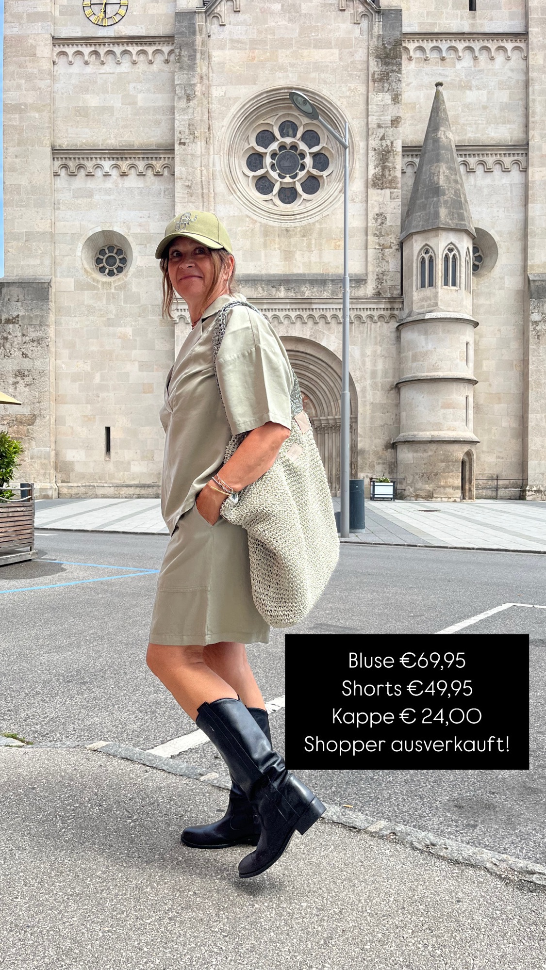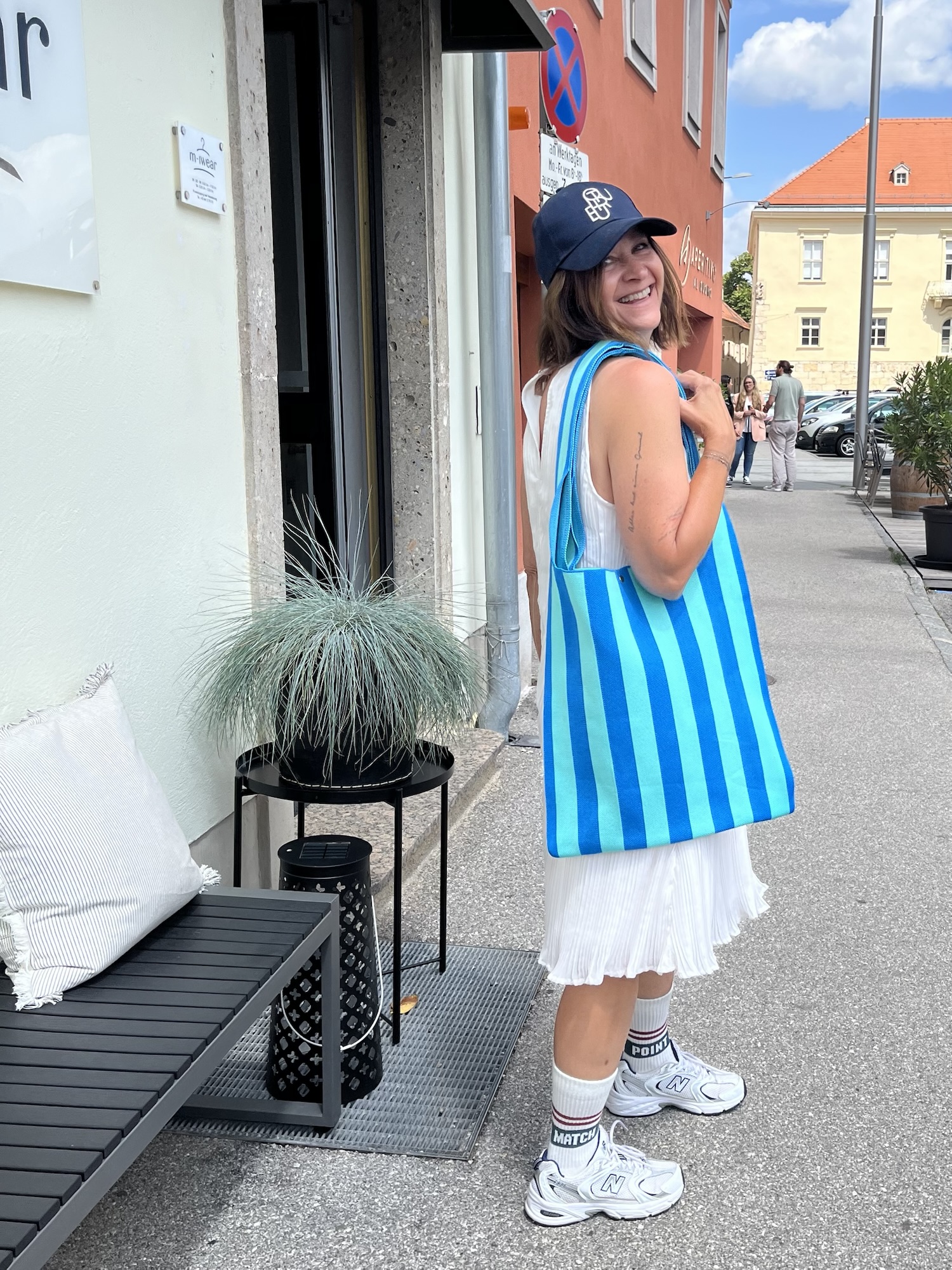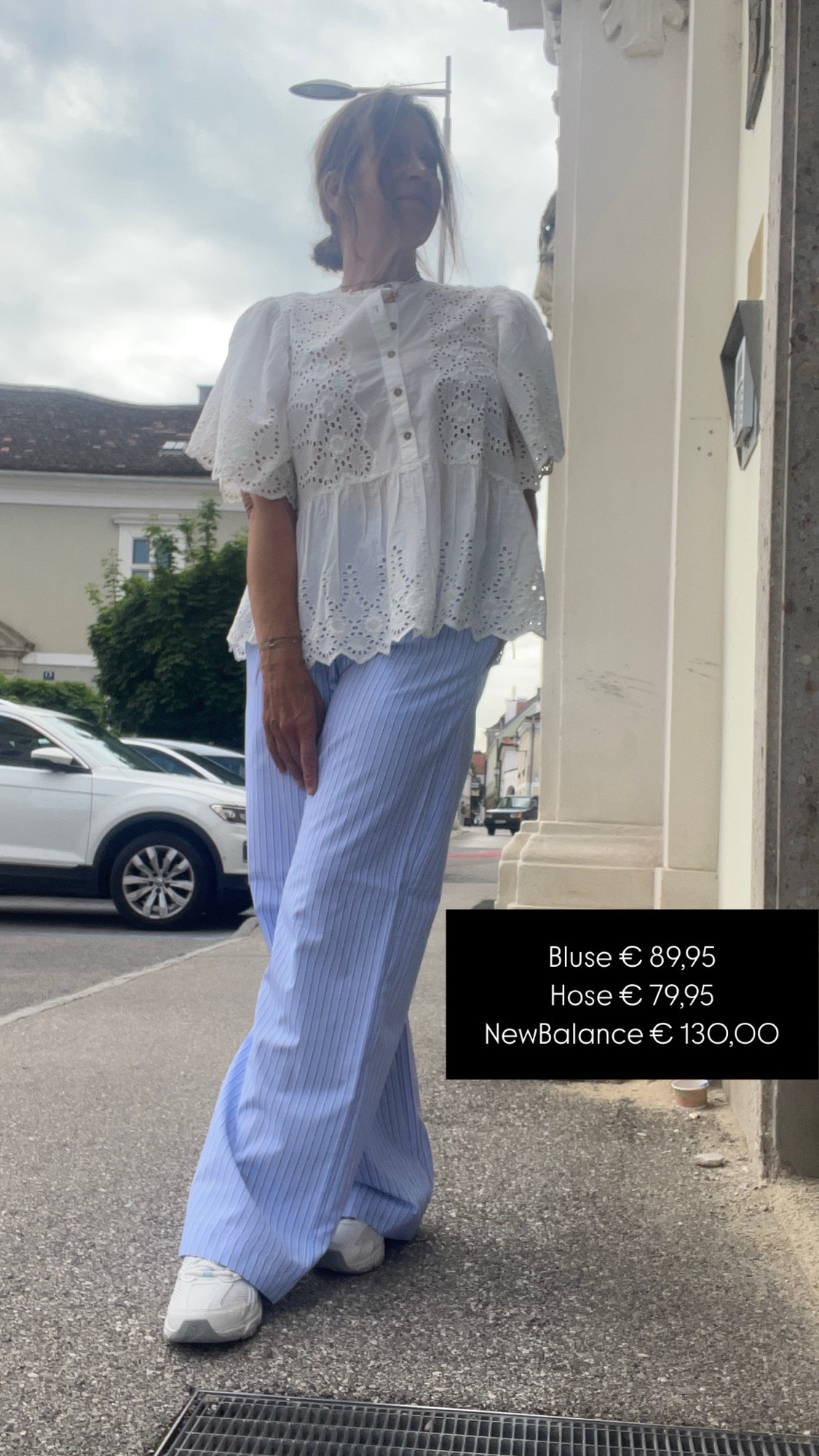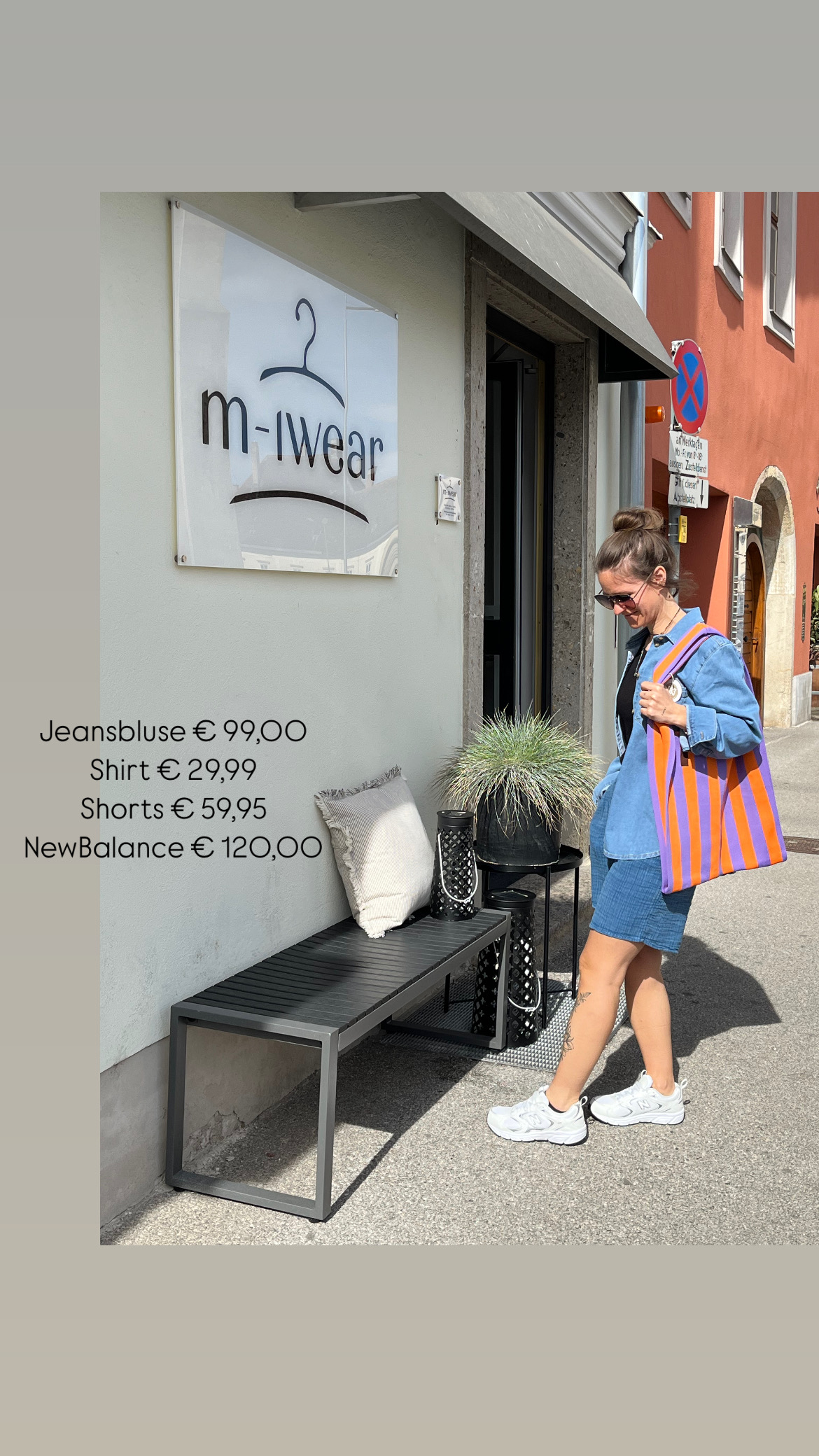 Gilet €79,95. Hose €89,95, Bluse €79,95, NewBalance €130,00 Shopper €24,99