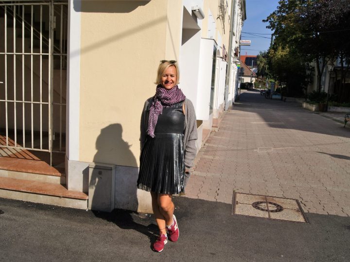 Glitzerkleid und Sneakers